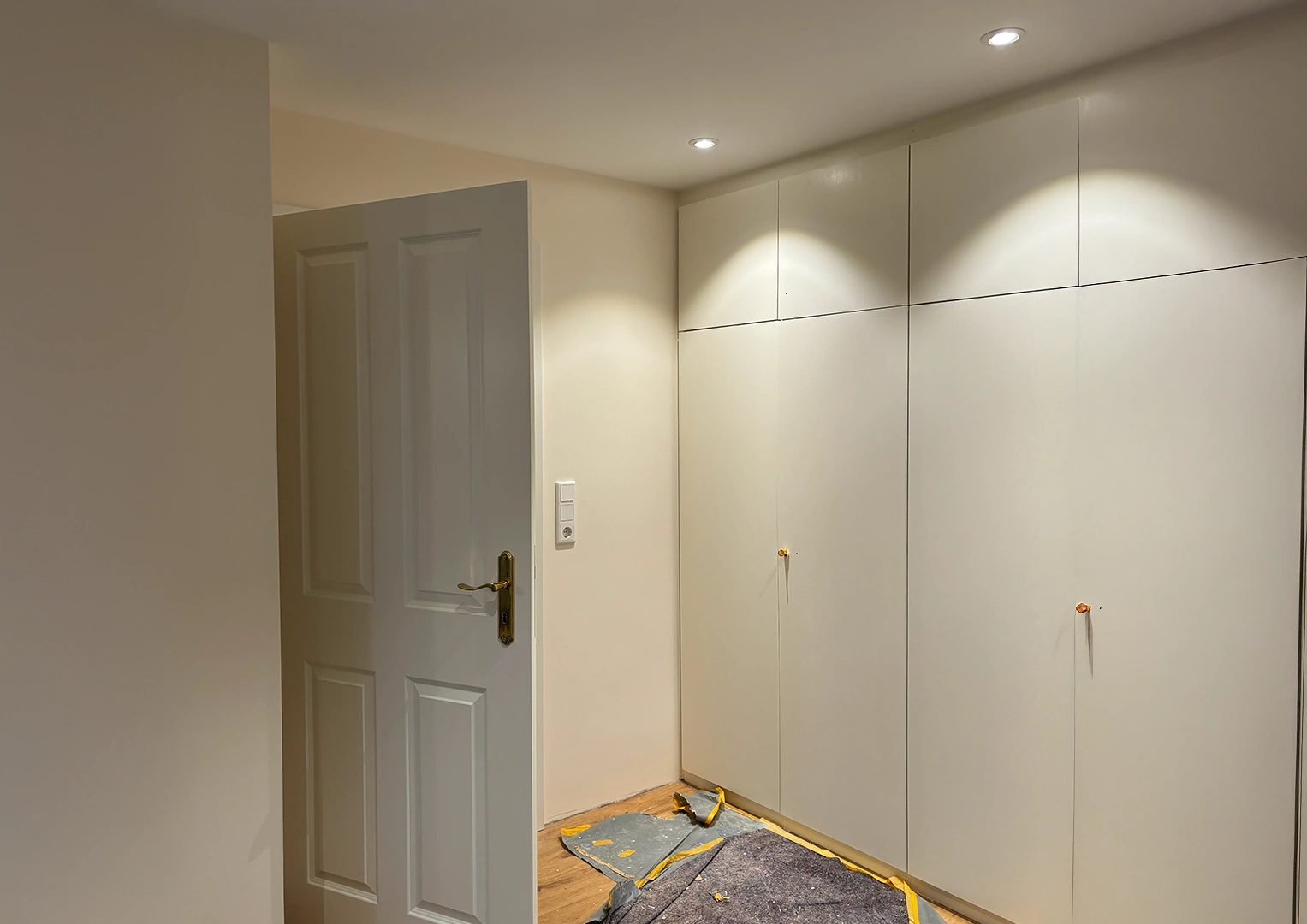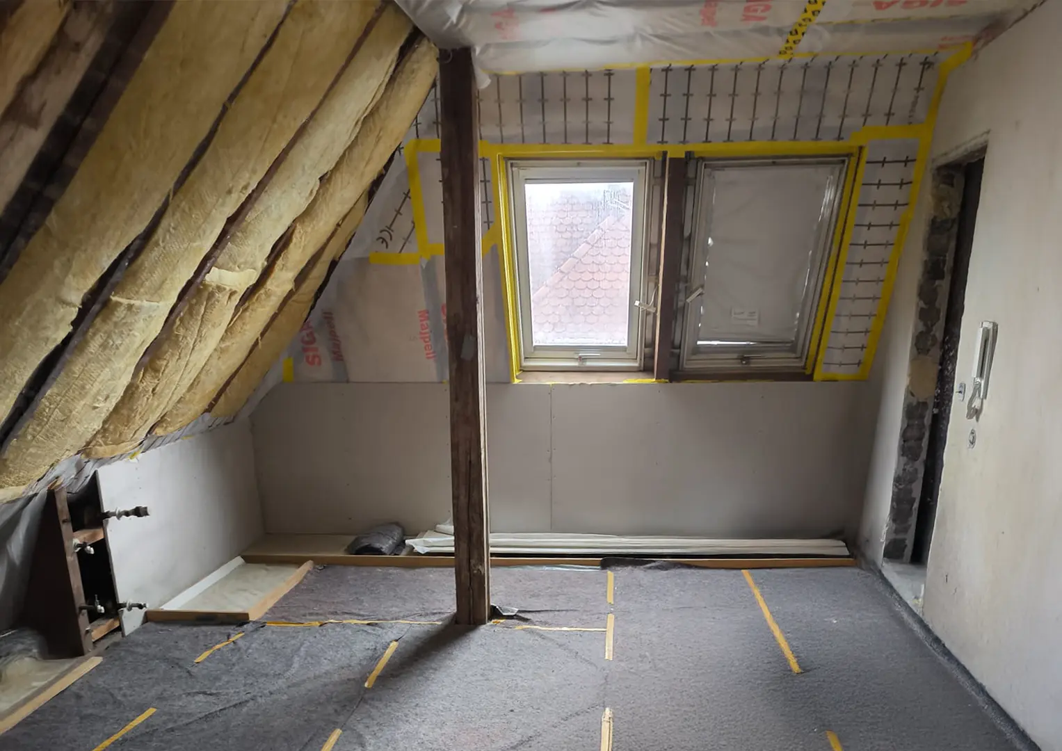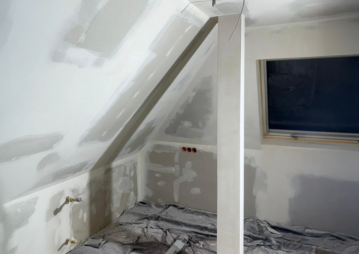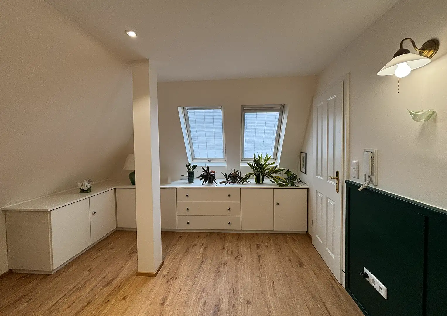 Zu Beginn der Umbauarbeiten wurden die Fronten sämtlicher Einbaumöbel entfernt, die Wand- und Dachschrägenverkleidungen ab- und die Bestandstüren ausgebaut. Anschließend erfolgte die innere Dachsanierung: Der Raum wurde abgedichtet, gedämmt und alle Flächen – Wände, Dachschrägen und Decke – mit Gipskarton verkleidet. Nach dem Spachteln und Streichen in einem hellen Farbton entstanden klare, freundliche Flächen, die die gewünschte offene und ruhige Raumatmosphäre unterstützen.