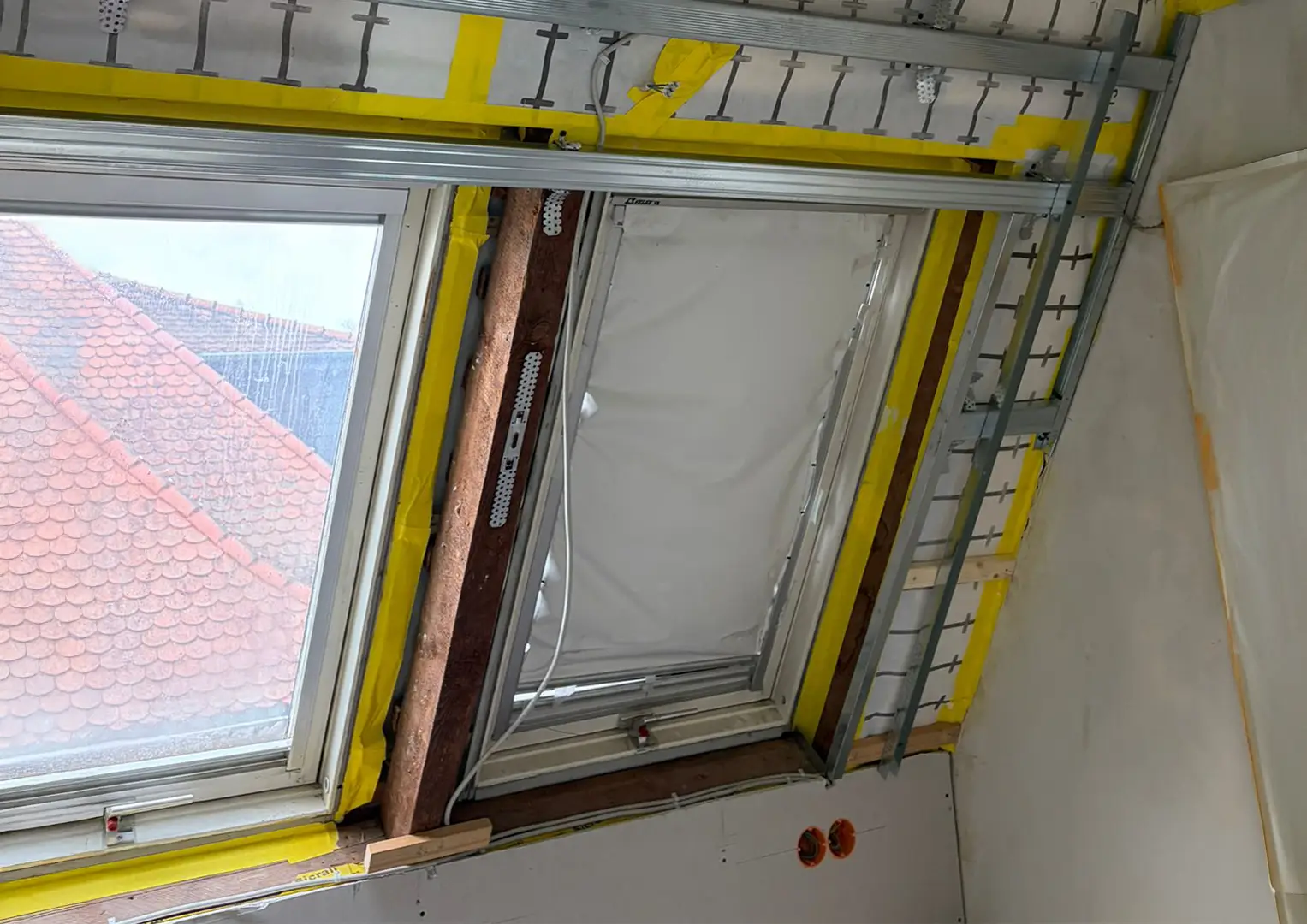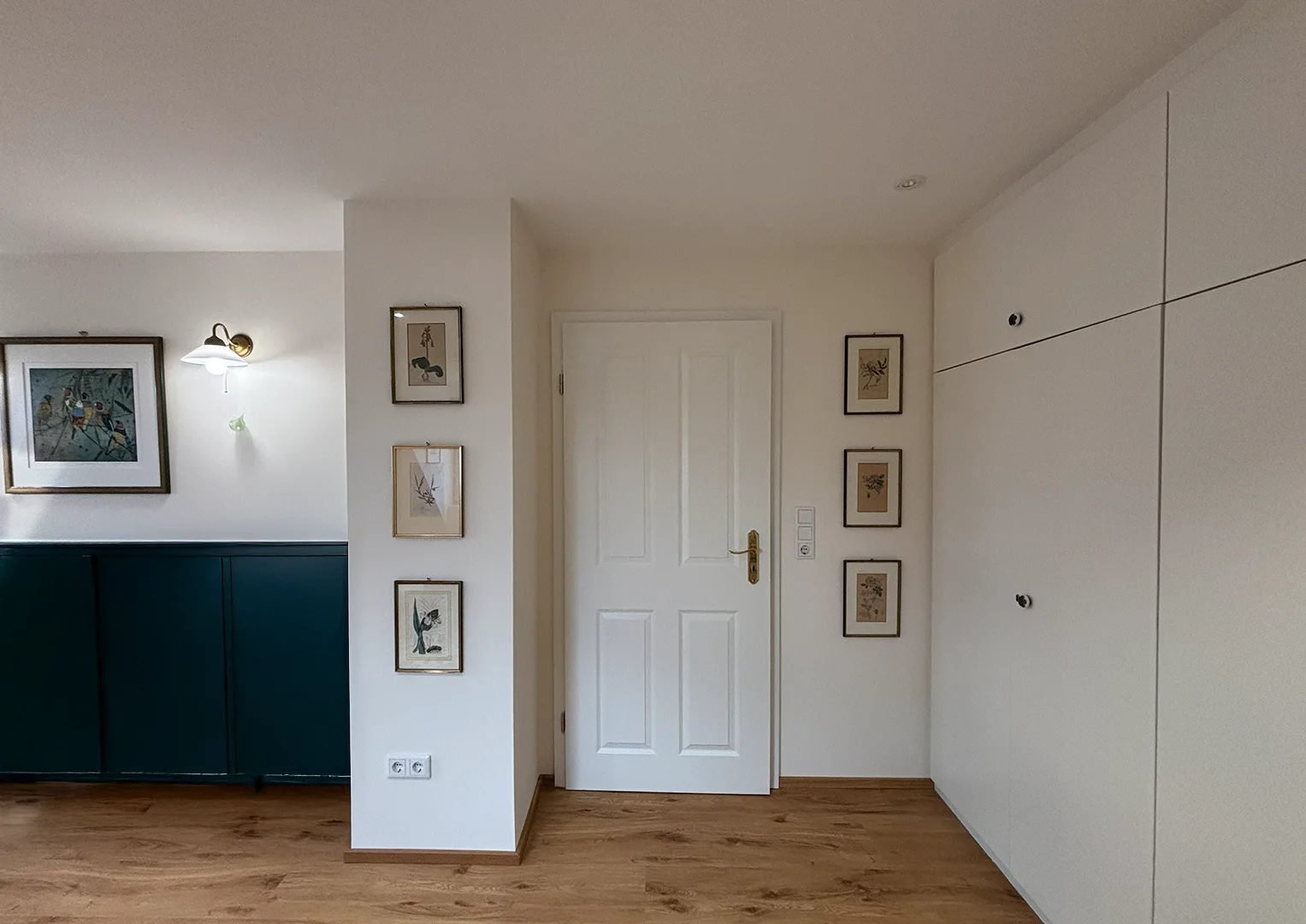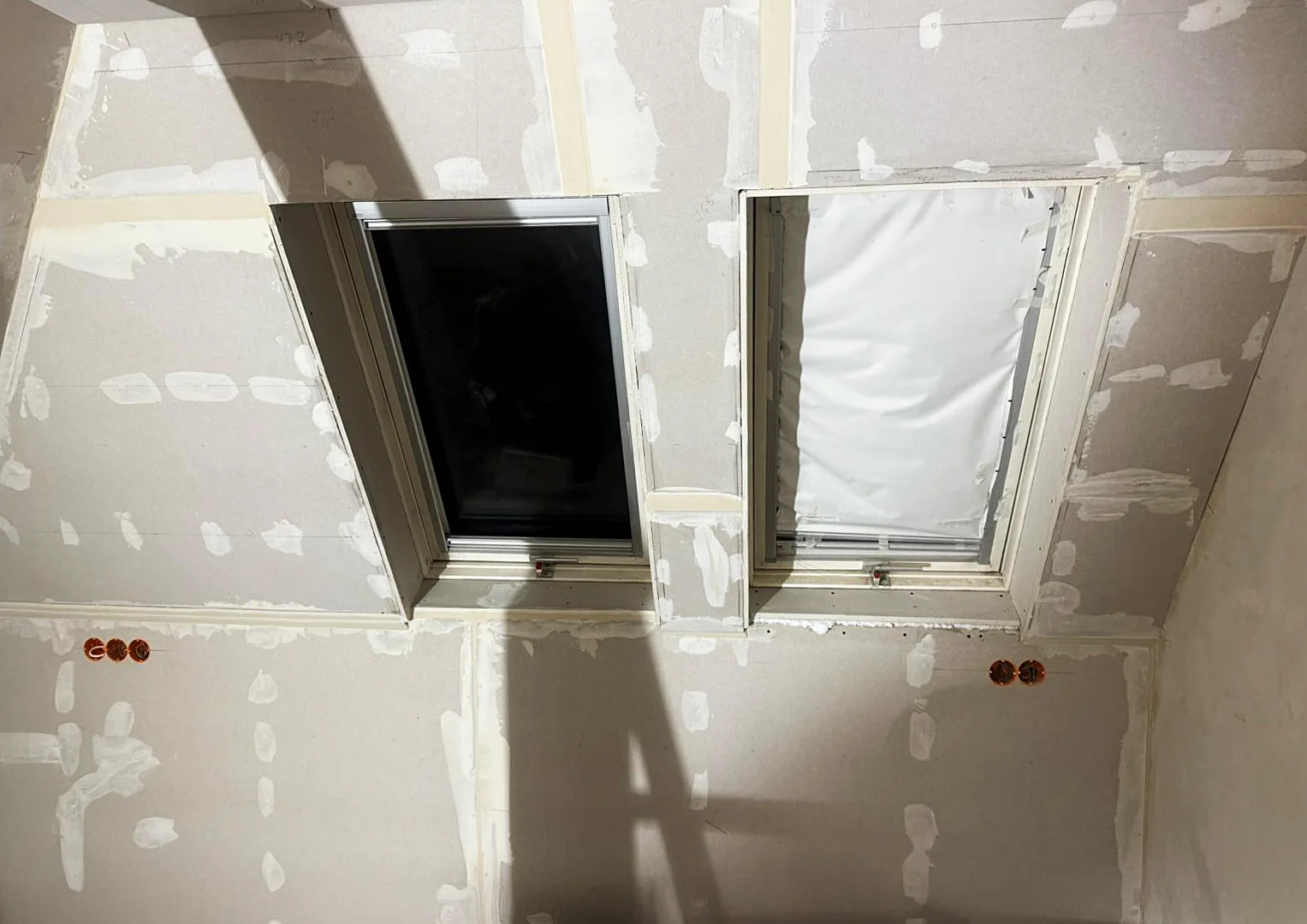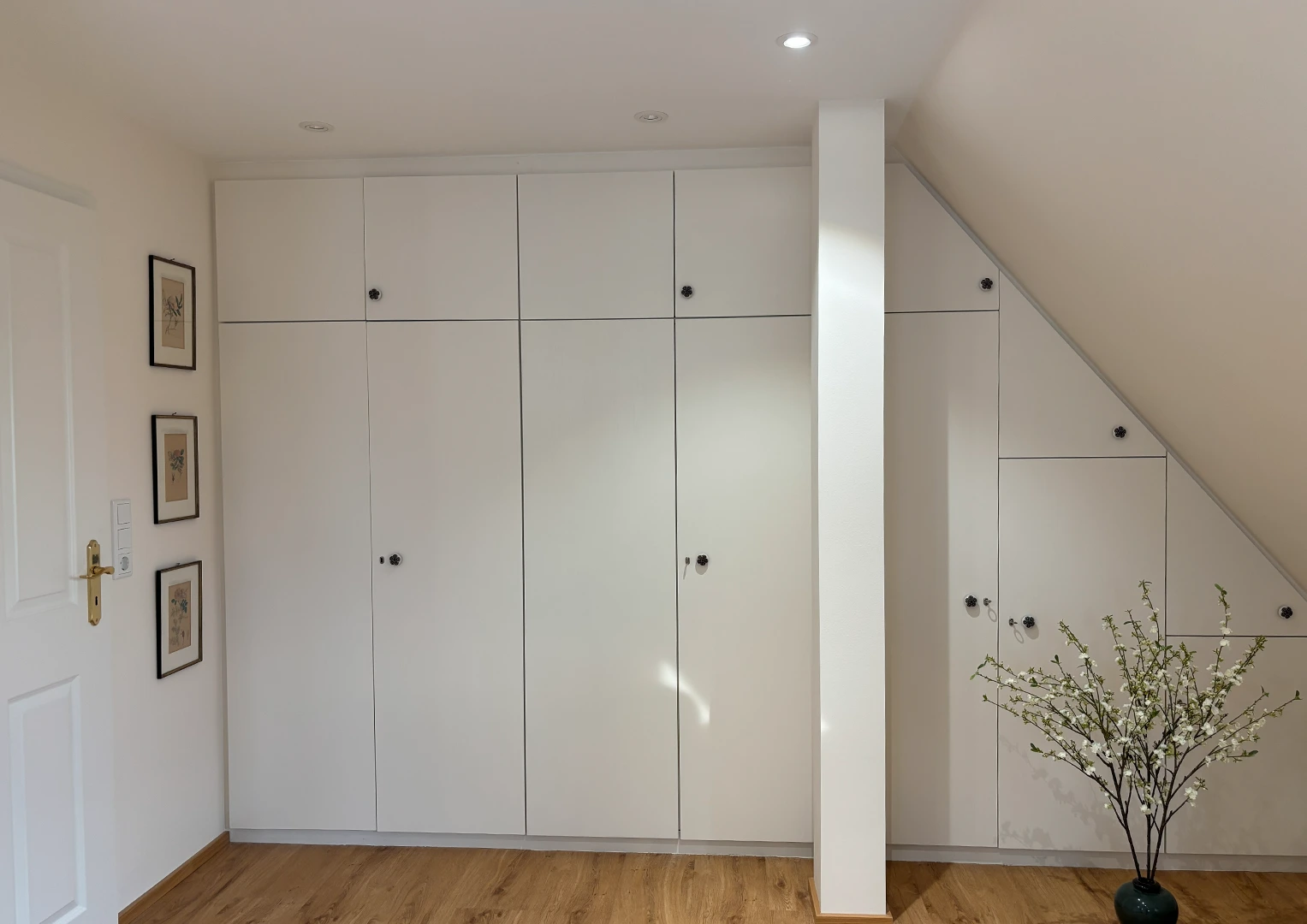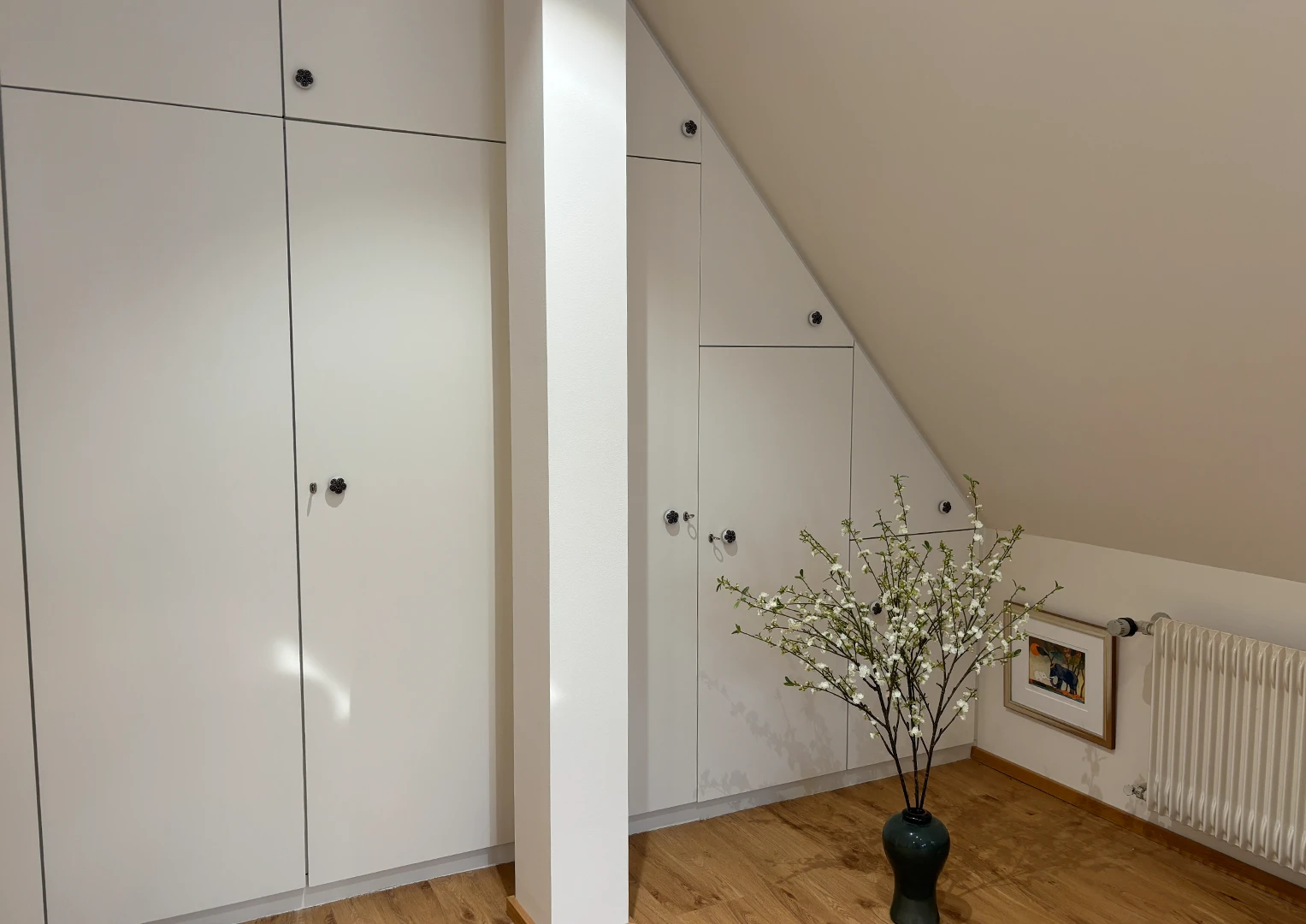 Zu Beginn der Umbauarbeiten wurden die Fronten sämtlicher Einbaumöbel entfernt, die Wand- und Dachschrägenverkleidungen ab- und die Bestandstüren ausgebaut. Anschließend erfolgte die innere Dachsanierung: Der Raum wurde abgedichtet, gedämmt und alle Flächen – Wände, Dachschrägen und Decke – mit Gipskarton verkleidet. Nach dem Spachteln und Streichen in einem hellen Farbton entstanden klare, freundliche Flächen, die die gewünschte offene und ruhige Raumatmosphäre unterstützen.