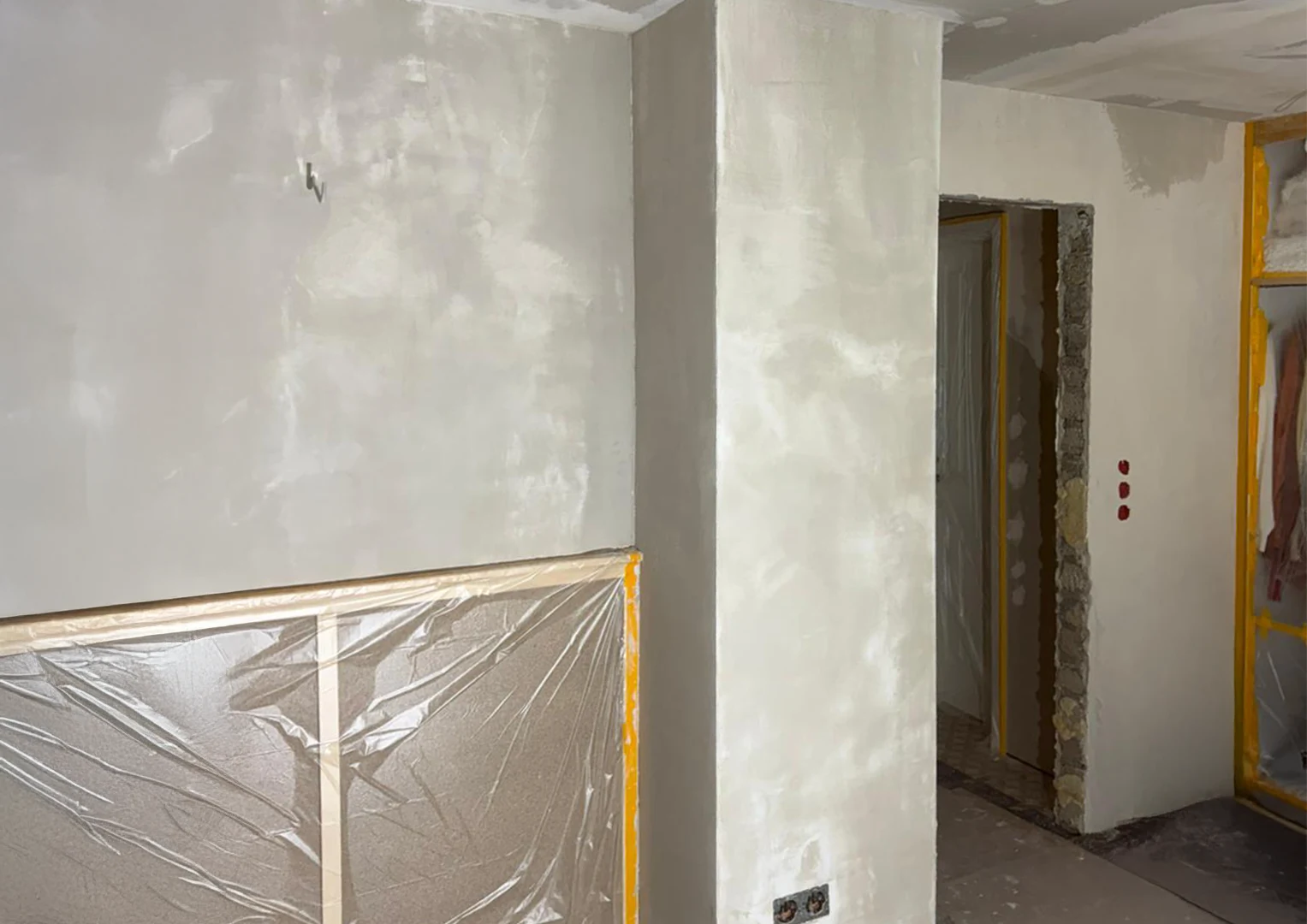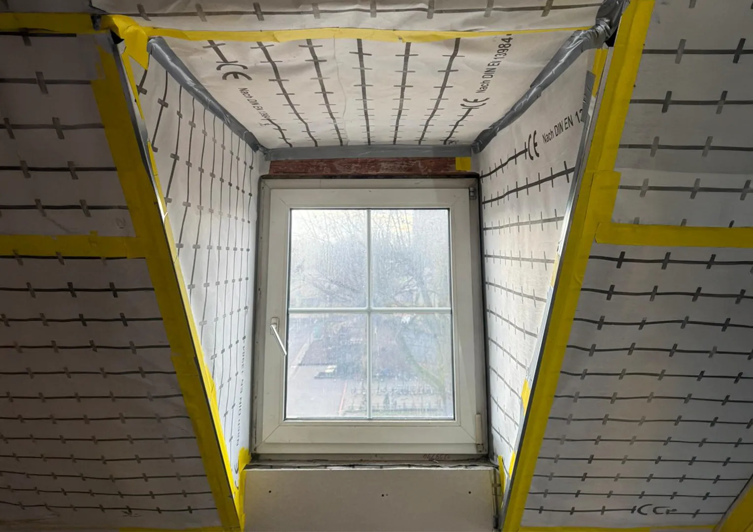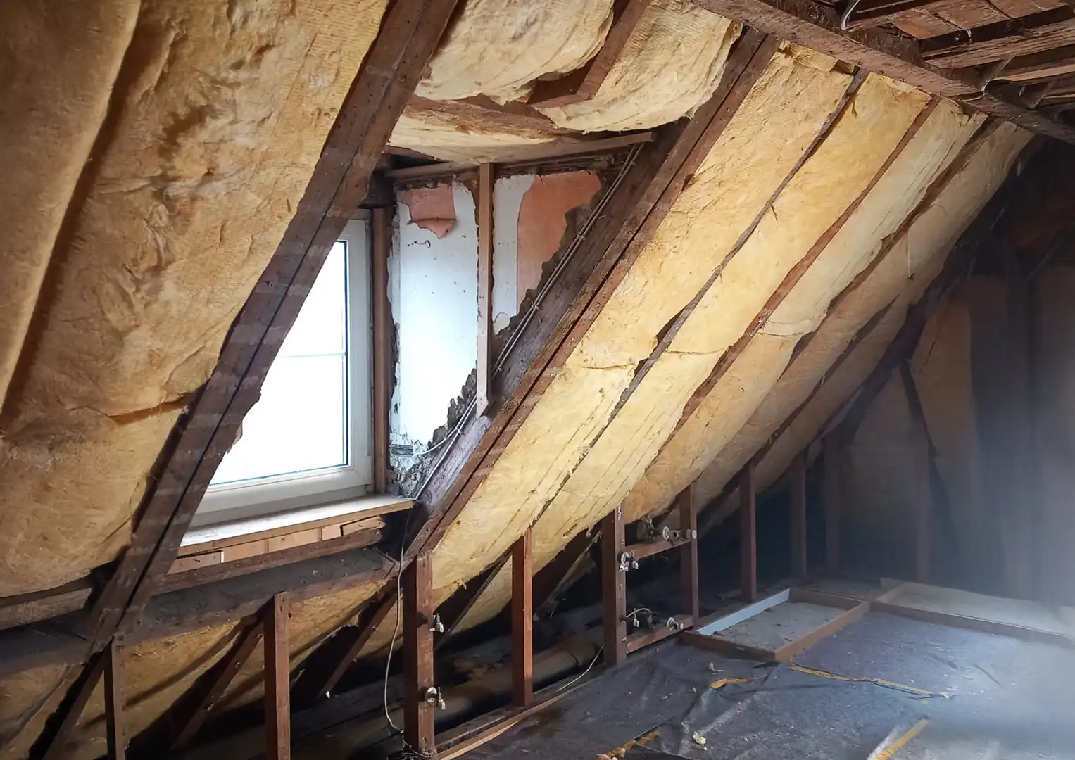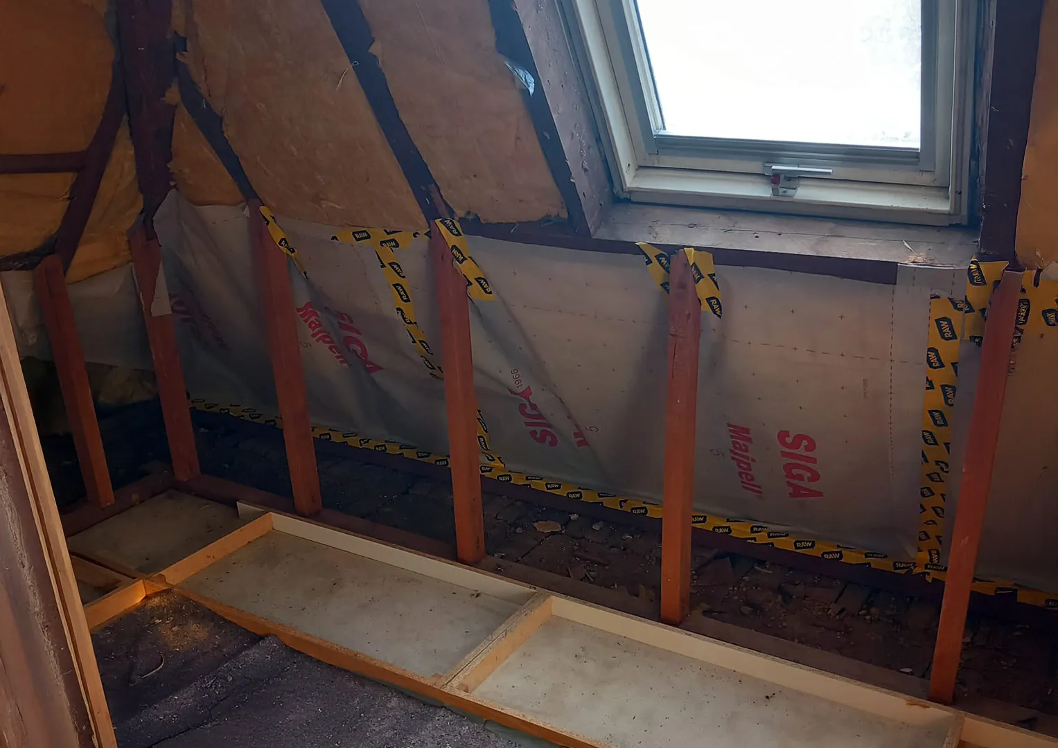 Zu Beginn der Umbauarbeiten wurden die Fronten sämtlicher Einbaumöbel entfernt, die Wand- und Dachschrägenverkleidungen ab- und die Bestandstüren ausgebaut. Anschließend erfolgte die innere Dachsanierung: Der Raum wurde abgedichtet, gedämmt und alle Flächen – Wände, Dachschrägen und Decke – mit Gipskarton verkleidet. Nach dem Spachteln und Streichen in einem hellen Farbton entstanden klare, freundliche Flächen, die die gewünschte offene und ruhige Raumatmosphäre unterstützen.
