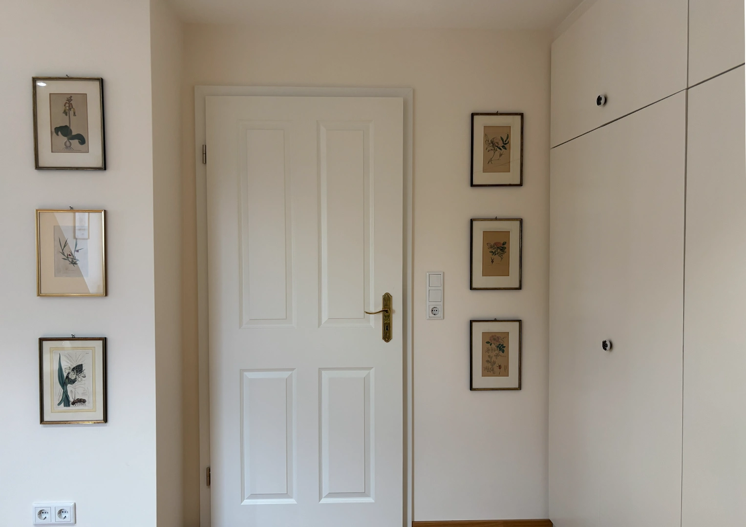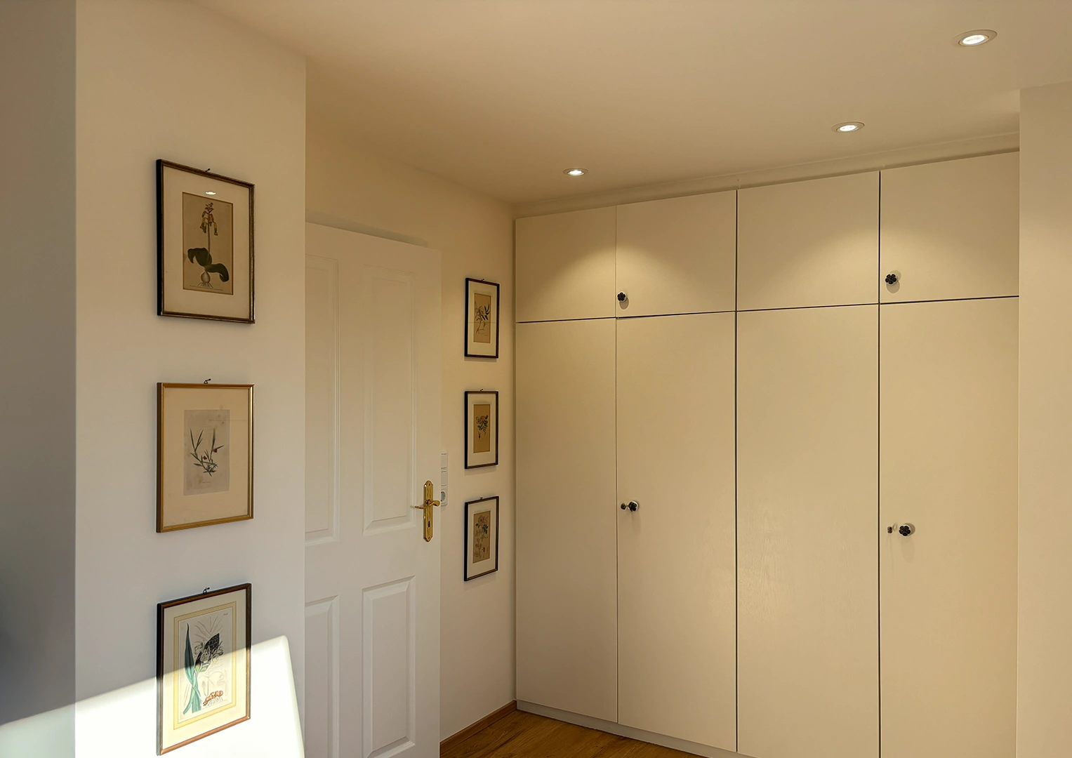 Die bestehenden Einbauschränke wurden in sanften Beigetönen neugestaltet und fügen sich harmonisch in das Gesamtbild ein. Akzente setzen die Sitzmöbel im Gesprächsbereich und die dem Raum Tiefe sowie Wärme verleihen. Dezente Messingdetails an Beschlägen und Leuchten ergänzen das Materialkonzept und sorgen für eine edle, ruhige Ausstrahlung.
