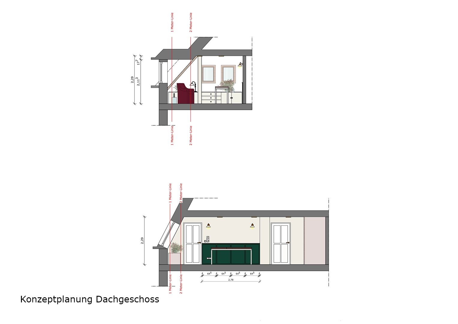 Im Fokus stand dabei die Entwicklung eines stimmigen Gesamtkonzepts, das sowohl die optimale Nutzung des Dachgeschosses als auch eine ruhige, einladende Atmosphäre durch gezielte Material-, Farb- und Lichtgestaltung gewährleistet. Ein wesentlicher Bestandteil der Planung war die Neugestaltung der Beleuchtung, um den Raum gleichmäßig, angenehm und funktional auszuleuchten. Durch eine bewusste Auswahl heller, natürlicher Materialien und zurückhaltender Farbtöne wurde das Dachgeschoss neu interpretiert und in seiner Wirkung geöffnet. Ziel war es, eine harmonische Balance zwischen Funktionalität, Lichtführung und räumlicher Ruhe zu schaffen.