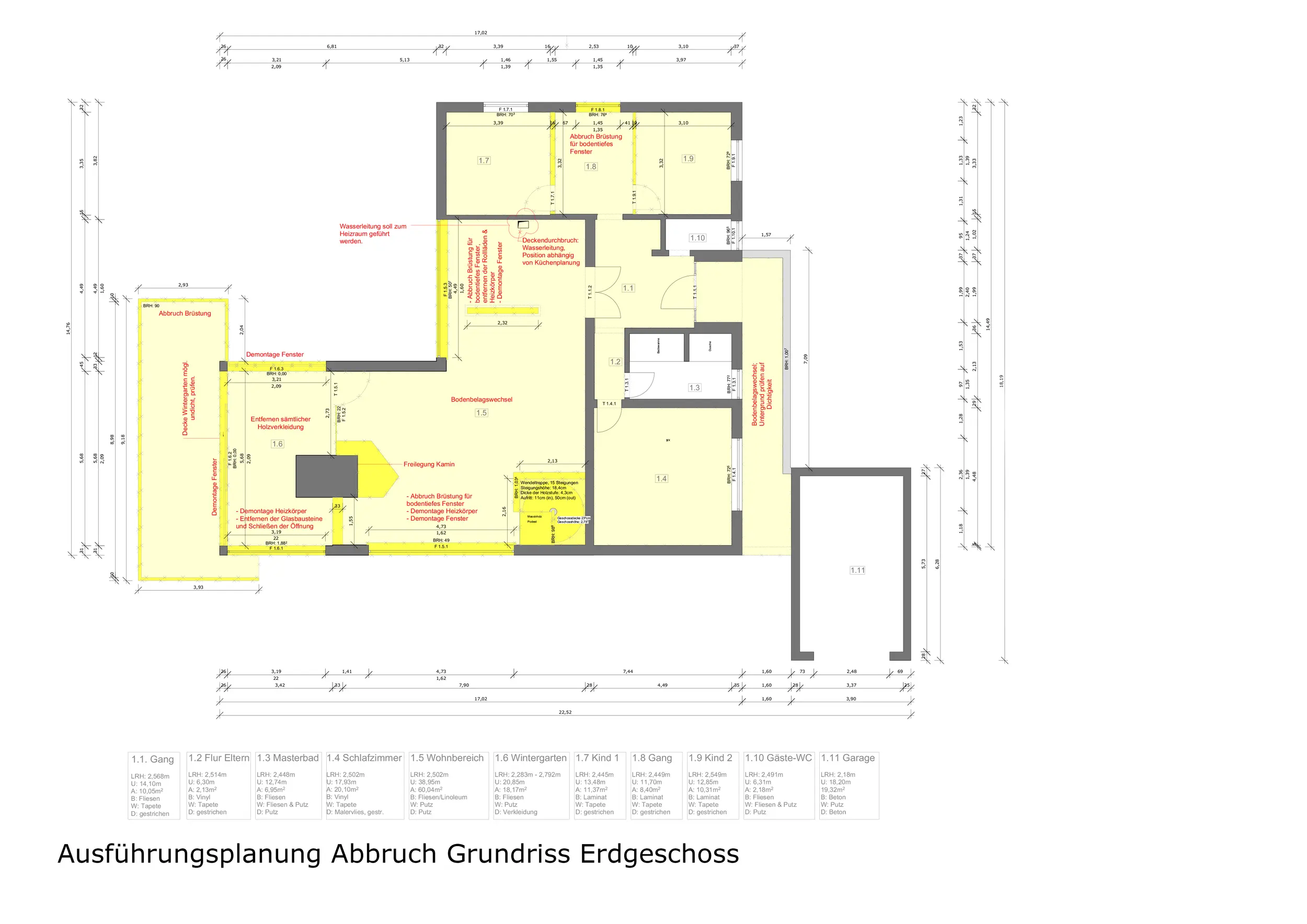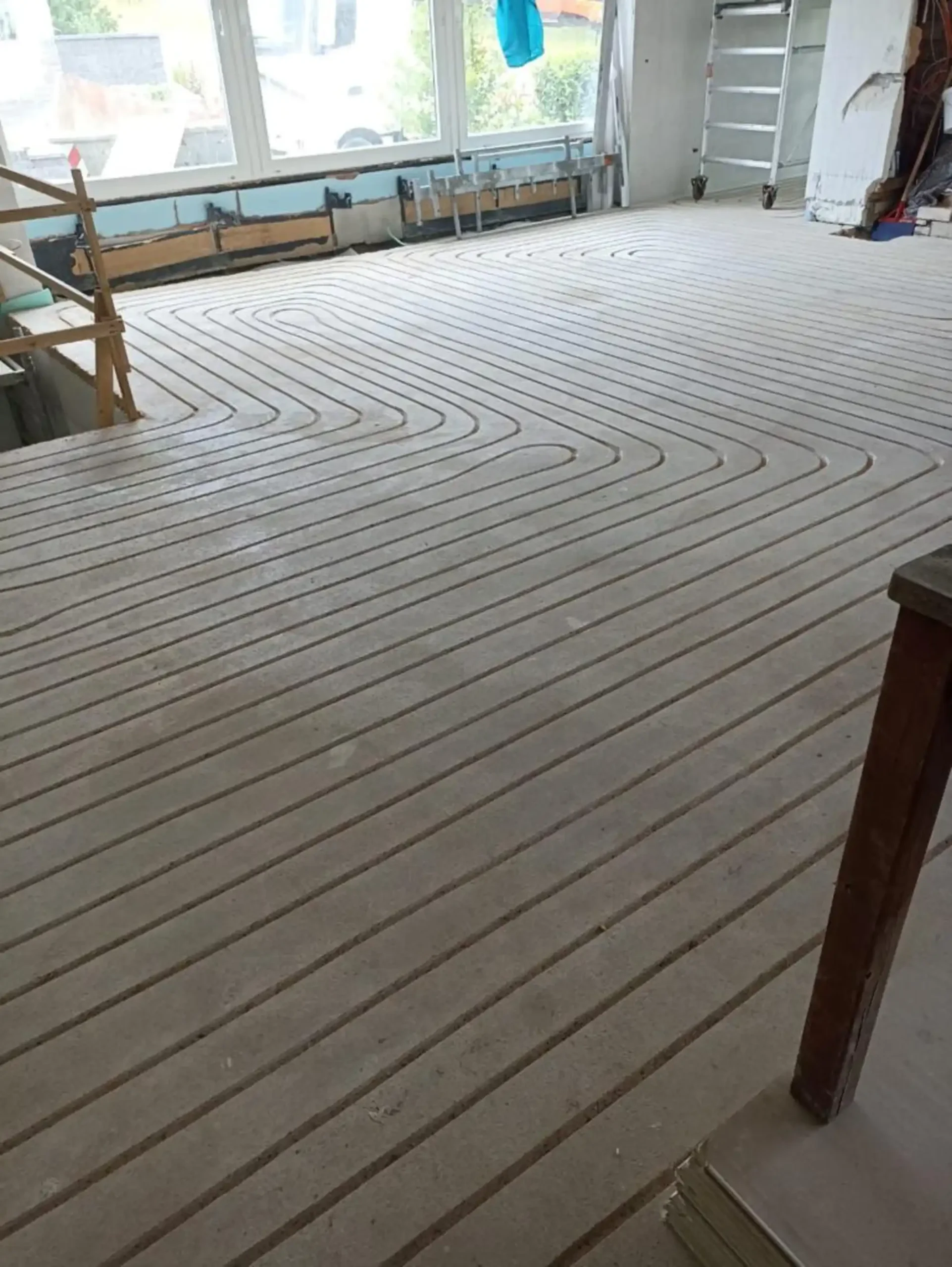 Zu Beginn der Bauarbeiten wurden die mehrschichtigen Bodenbeläge und Wandaufbauten zurückgebaut. Aufgrund des asphalthaltigen Estrichs musste dieser vollständig entfernt werden. In den neu eingebrachten Estrich wurde die Fußbodenheizung eingefräst und anschließend verfliest.