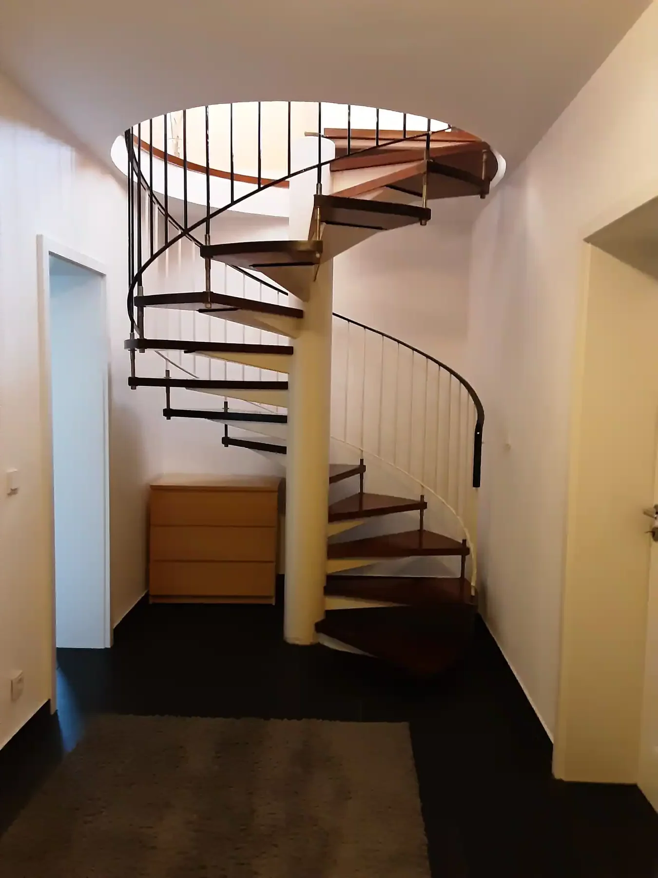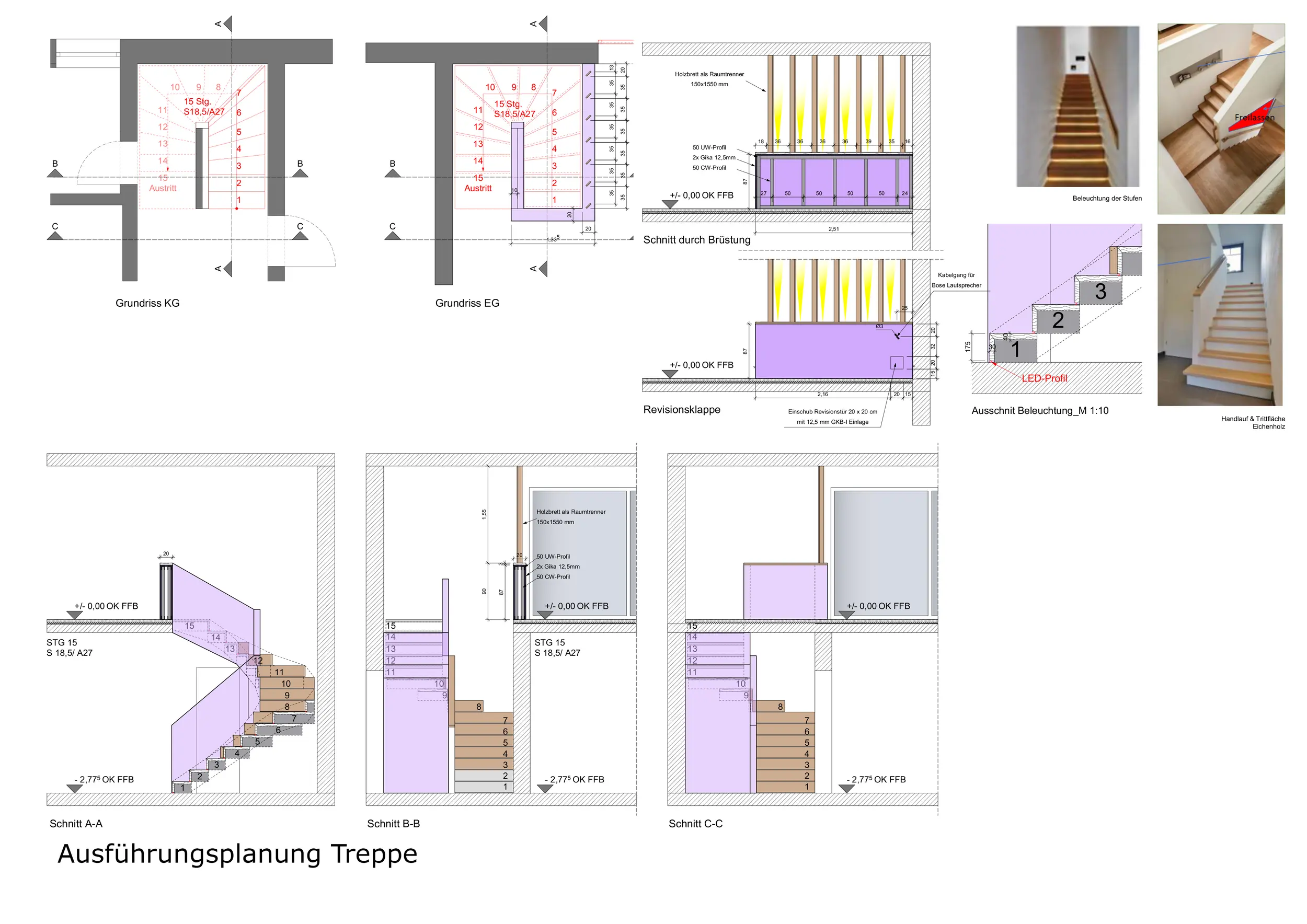 Die bestehende Wendeltreppe in das Kellergeschoss wurde durch eine neue halbgewendelte Stahlwangentreppe ersetzt, die mit Trockenbau verkleidet und mit Eichenholzstufen ausgestattet ist. Zur optischen Trennung von Wohn- und Treppenraum wurde ein Geländer mit integrierten vertikalen Eichenbohlen geplant und umgesetzt. Für die Sommermonate wurde im gesamten Wohnbereich eine Klimaanlage installiert.