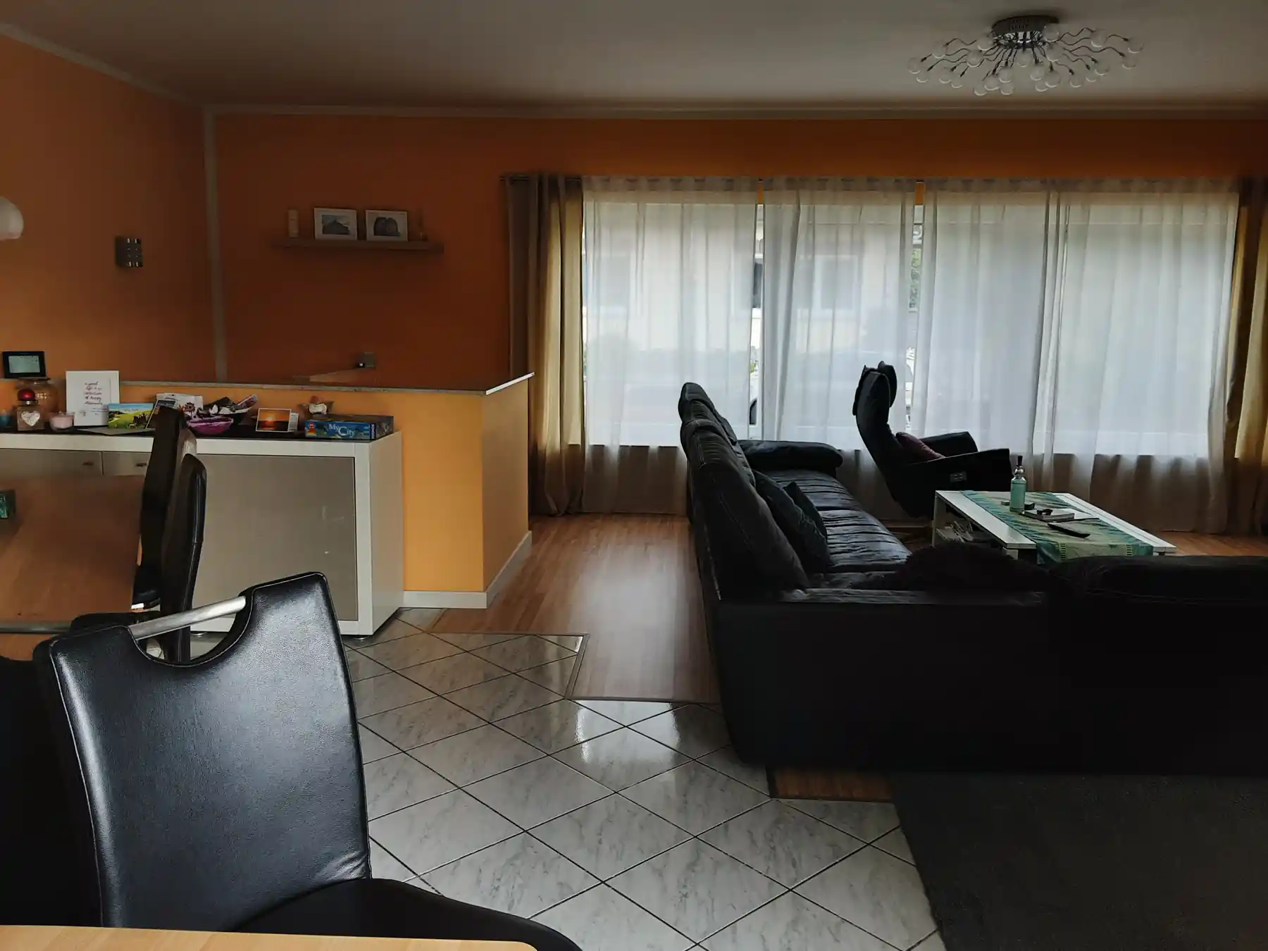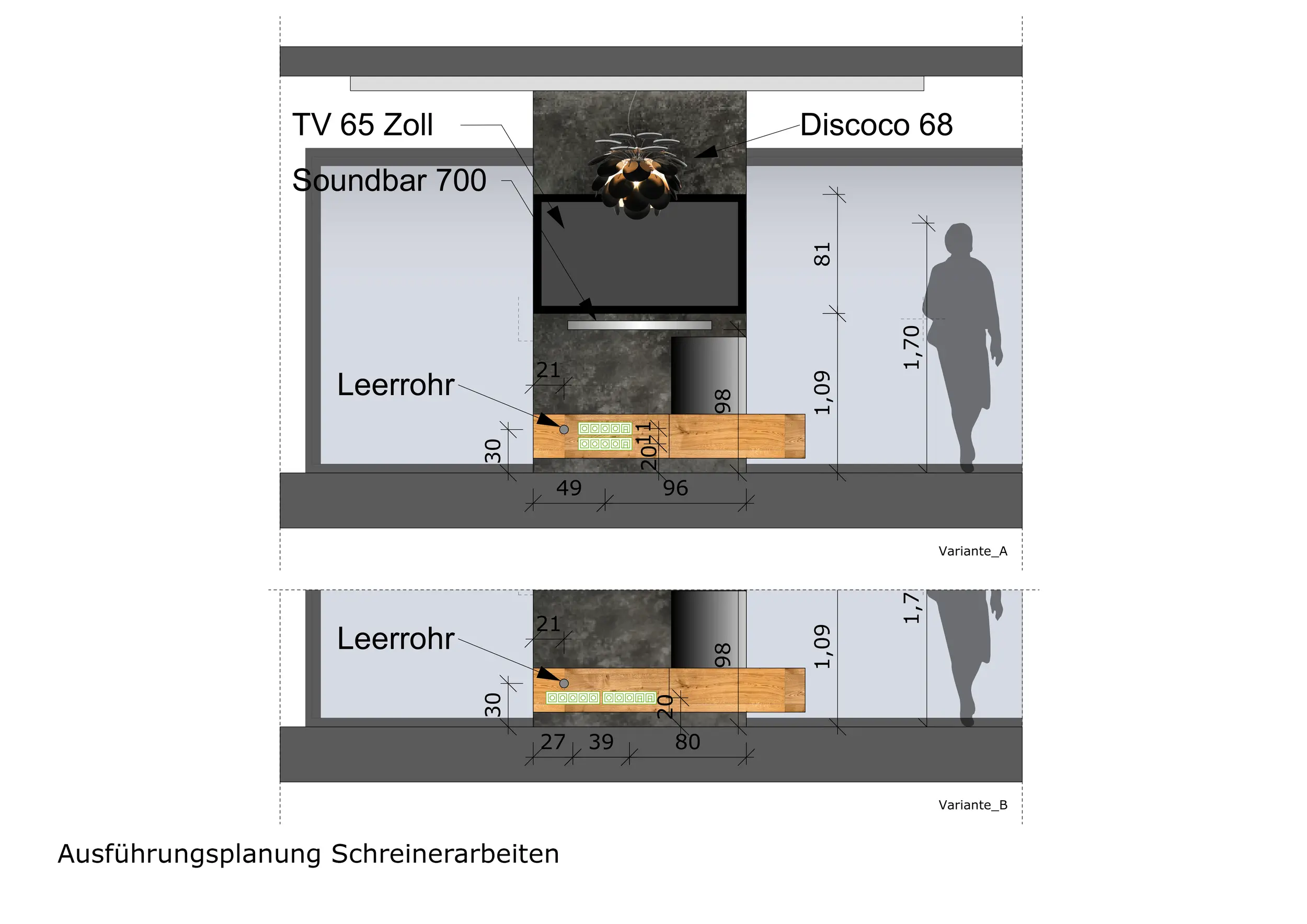 Als Grundbeleuchtung sind Einbauspots vorgesehen, die eine gleichmäßige und funktionale Ausleuchtung gewährleisten. Diese werden im Wohnzimmer durch Lichtvouten ergänzt, welche eine indirekte und gemütliche Lichtstimmung erzeugen. Im Essbereich ist die Möglichkeit vorgesehen, mehrere kleine Pendelleuchten zu integrieren, die den Raum gezielt akzentuieren und eine atmosphärische Beleuchtung schaffen. Zusätzlich sind Akzentbeleuchtungen über der Kochinsel geplant, um diesen Bereich funktional und optisch hervorzuheben.