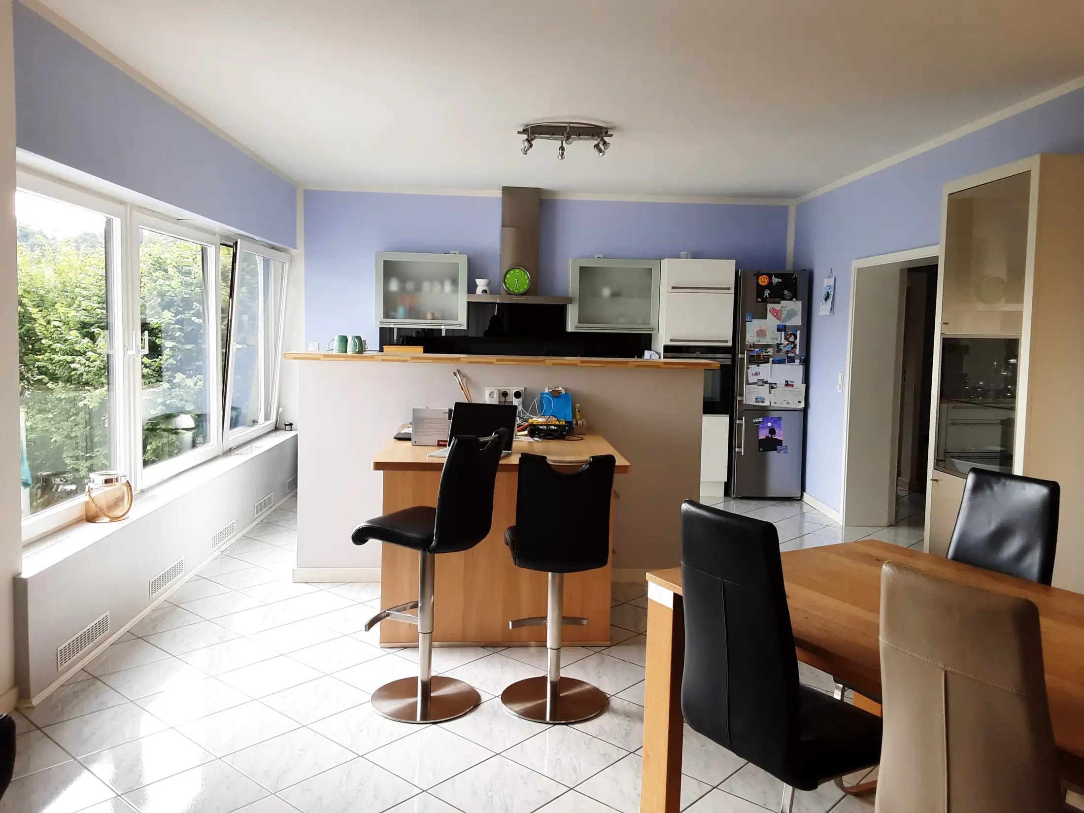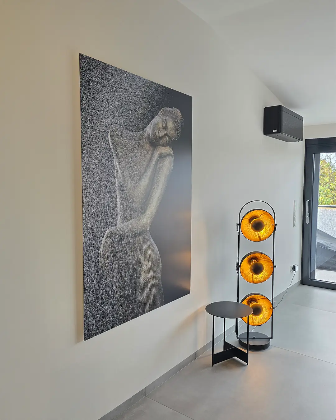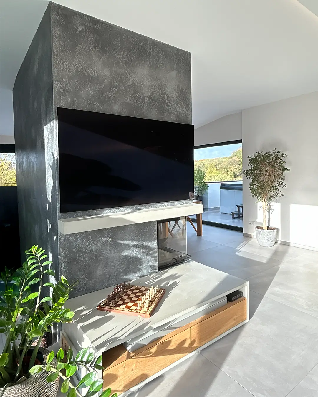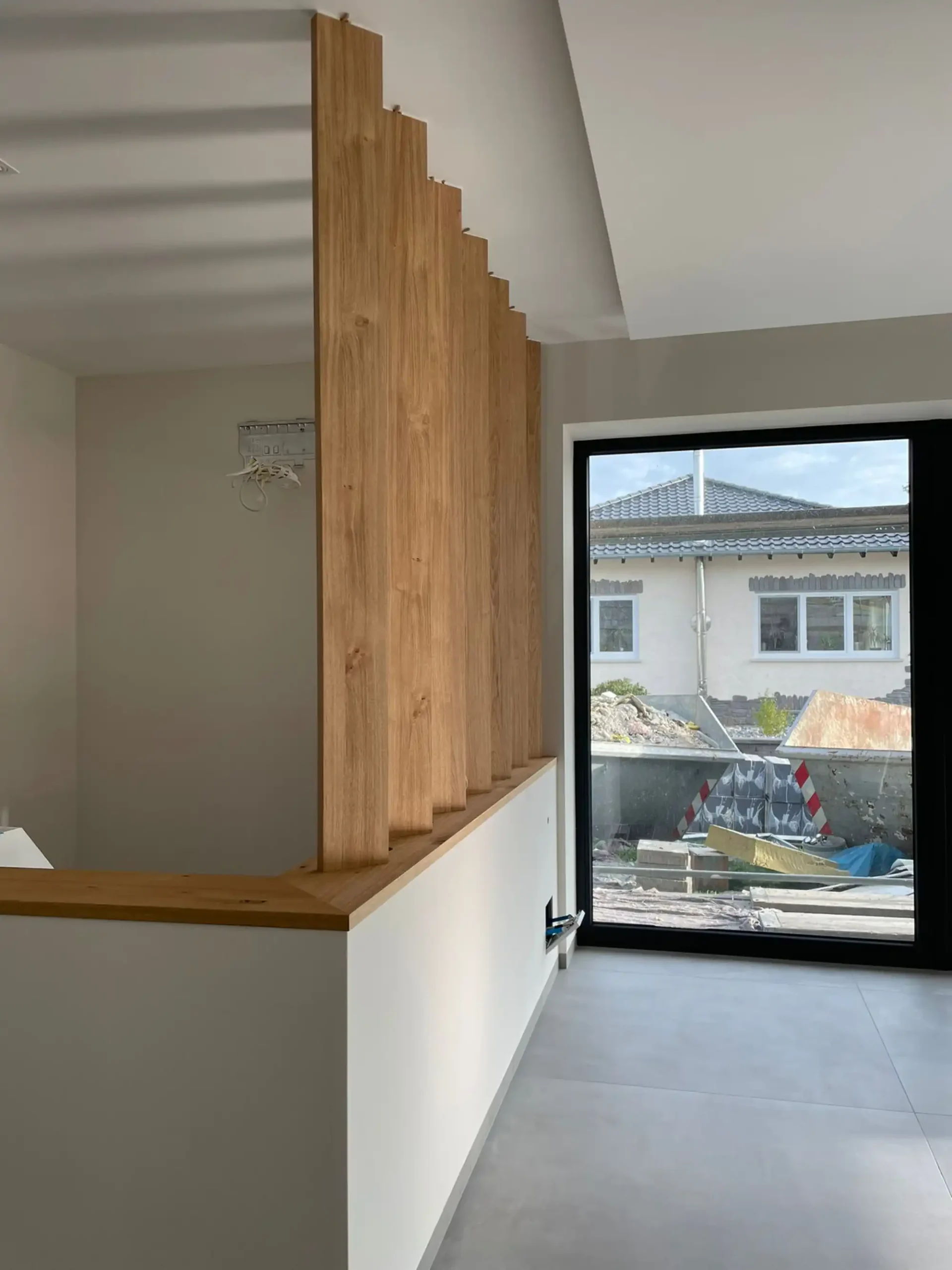 Ein zentrales Element des Projekts ist der neue Balkon, der zwischen der Nord-West-Fassade und dem Bestandsbalkon angeordnet wurde. Der Zugang erfolgt über ein neues bodentiefes Fensterelement in der Küche sowie über den modernisierten Wintergarten. Großformatige Fliesen im Format 1,20 × 1,20 m ziehen sich im gleichen Fugenbild vom Innenraum über den Balkon bis zur neuen Terrassenanlage und erzeugen einen fließenden Übergang zwischen Innen und Außen.