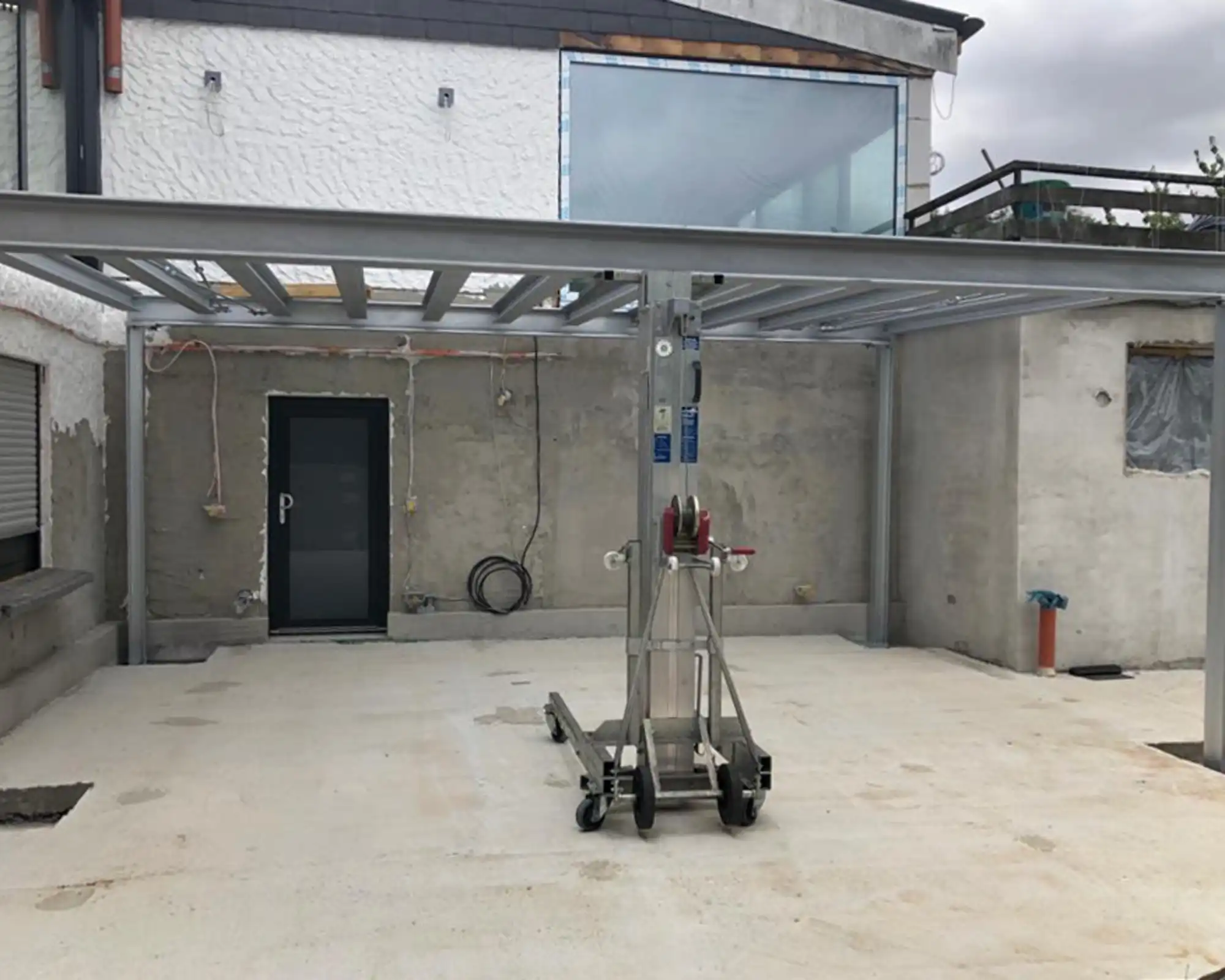 Das Treppenloch wurde für die neue halbgewendelte Stahlwangentreppe erweitert und der neue Kamin integriert. Es folgten der Einbau der neuen Fenster sowie der Innenausbau des Erdgeschosses. Parallel dazu begannen die Arbeiten im Außenbereich, darunter die Herstellung der neuen Treppenanlage zur Einliegerwohnung, die Erdarbeiten zur Ausbildung der unterschiedlichen Höhenniveaus sowie die Fertigung und Montage der Stahlkonstruktion für den neuen Balkon.