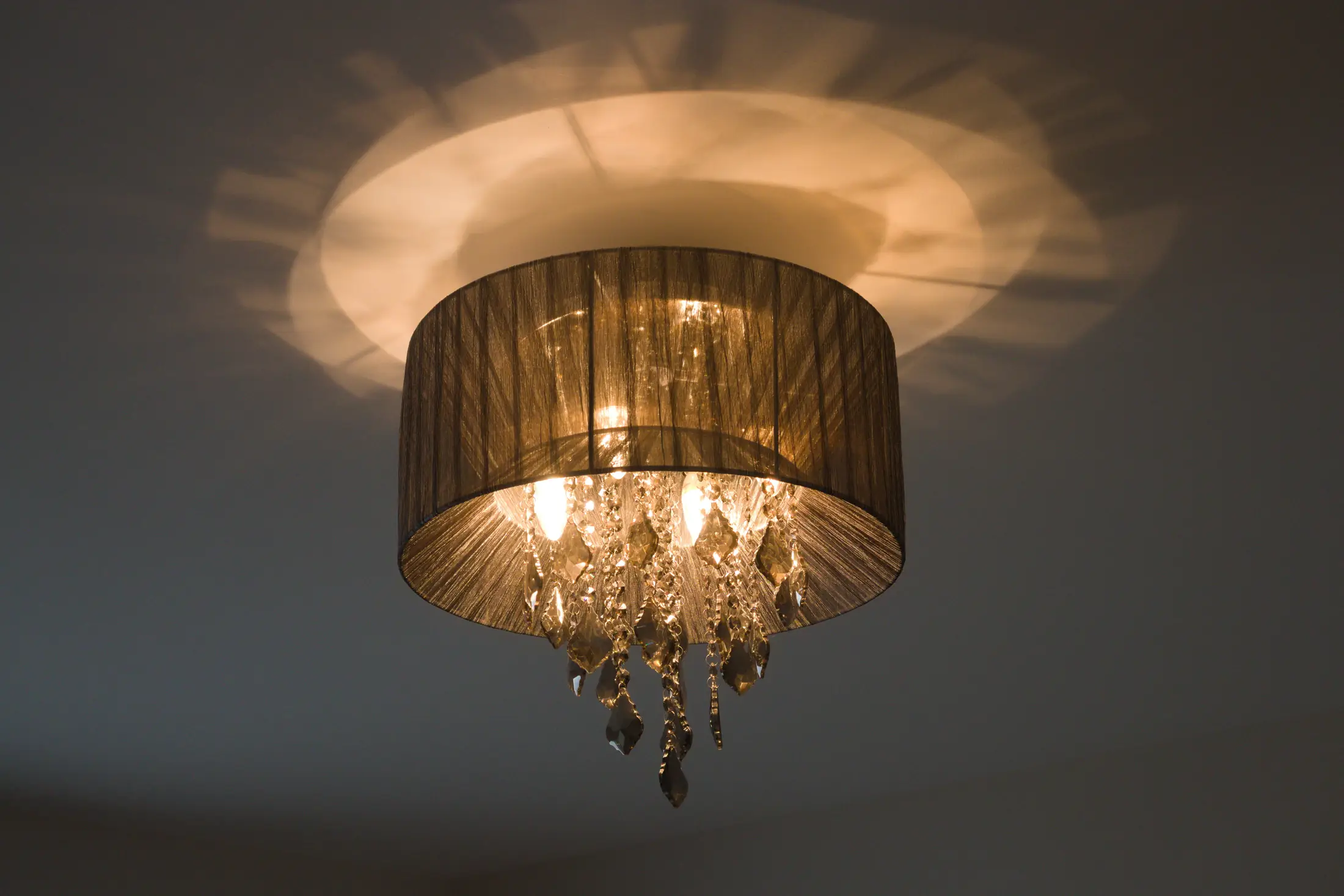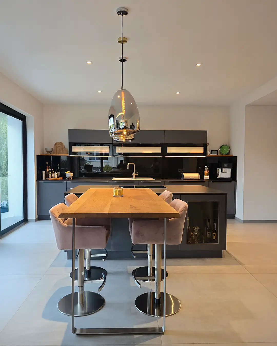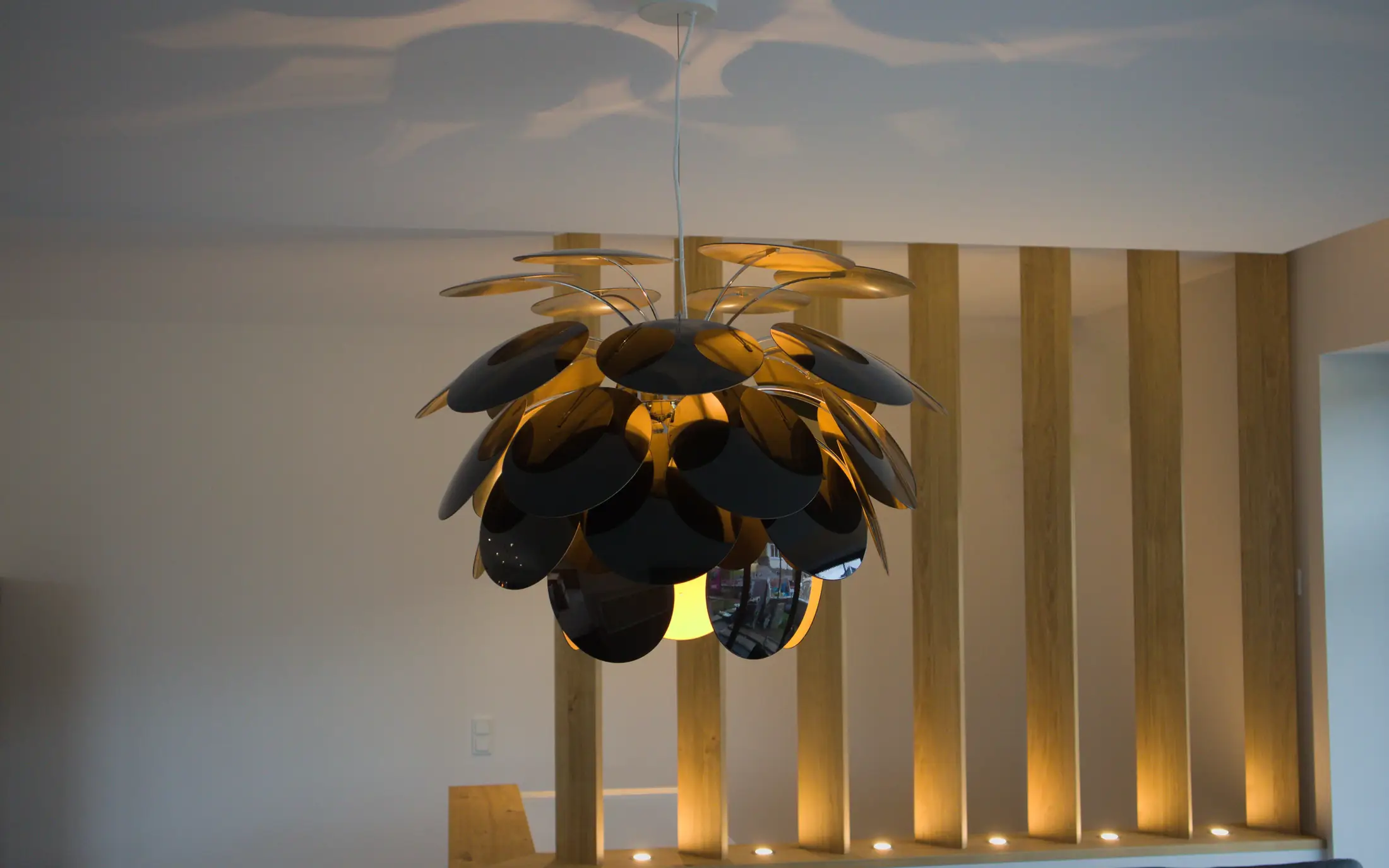 Im Wohnzimmer wird darüber hinaus eine große Discoco-Pendelleuchte eingesetzt, die durch ihr besonderes Lichtspiel und die charakteristischen Schattenwürfe an der Decke eine stimmungsvolle und dekorative Wirkung entfaltet.