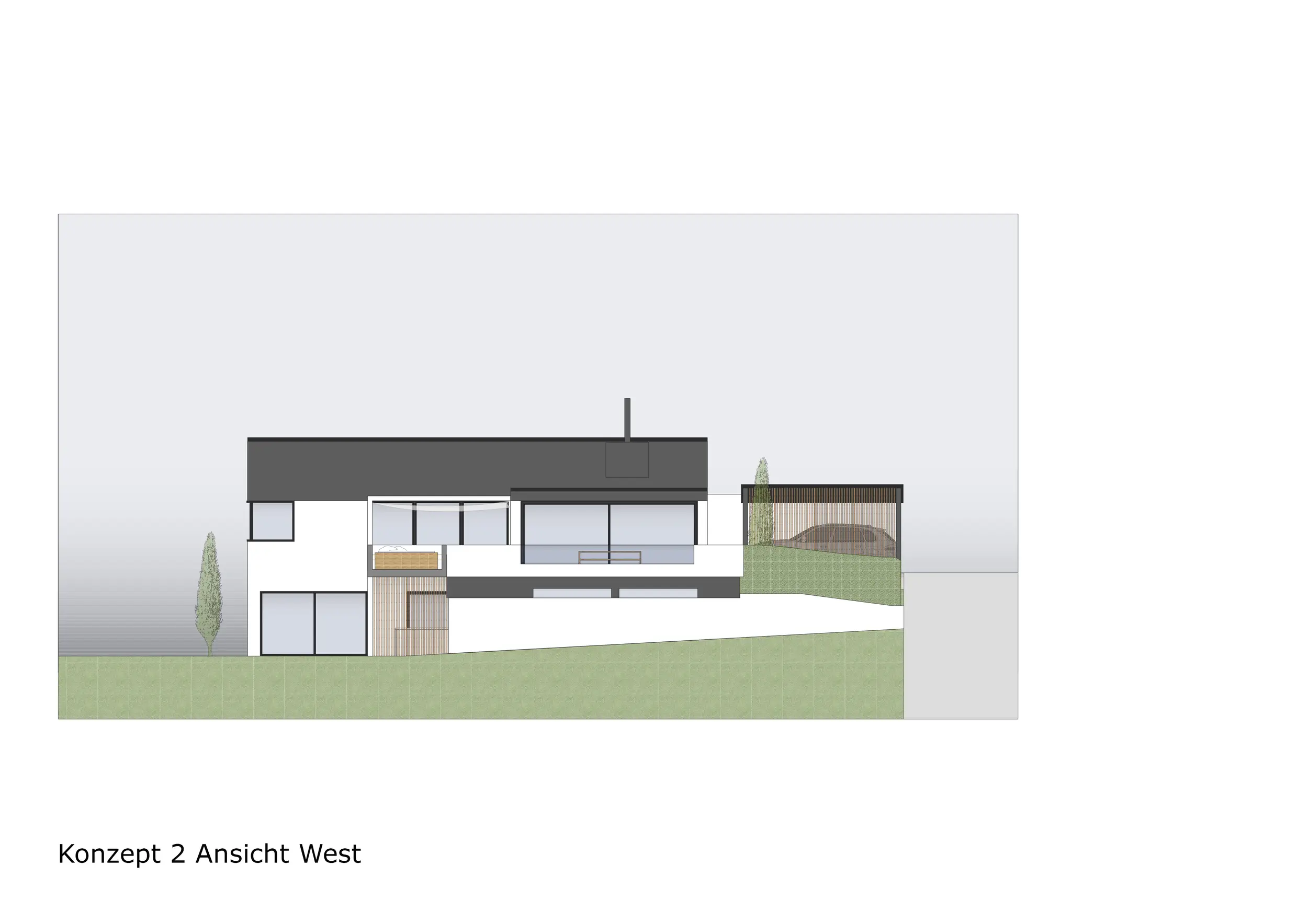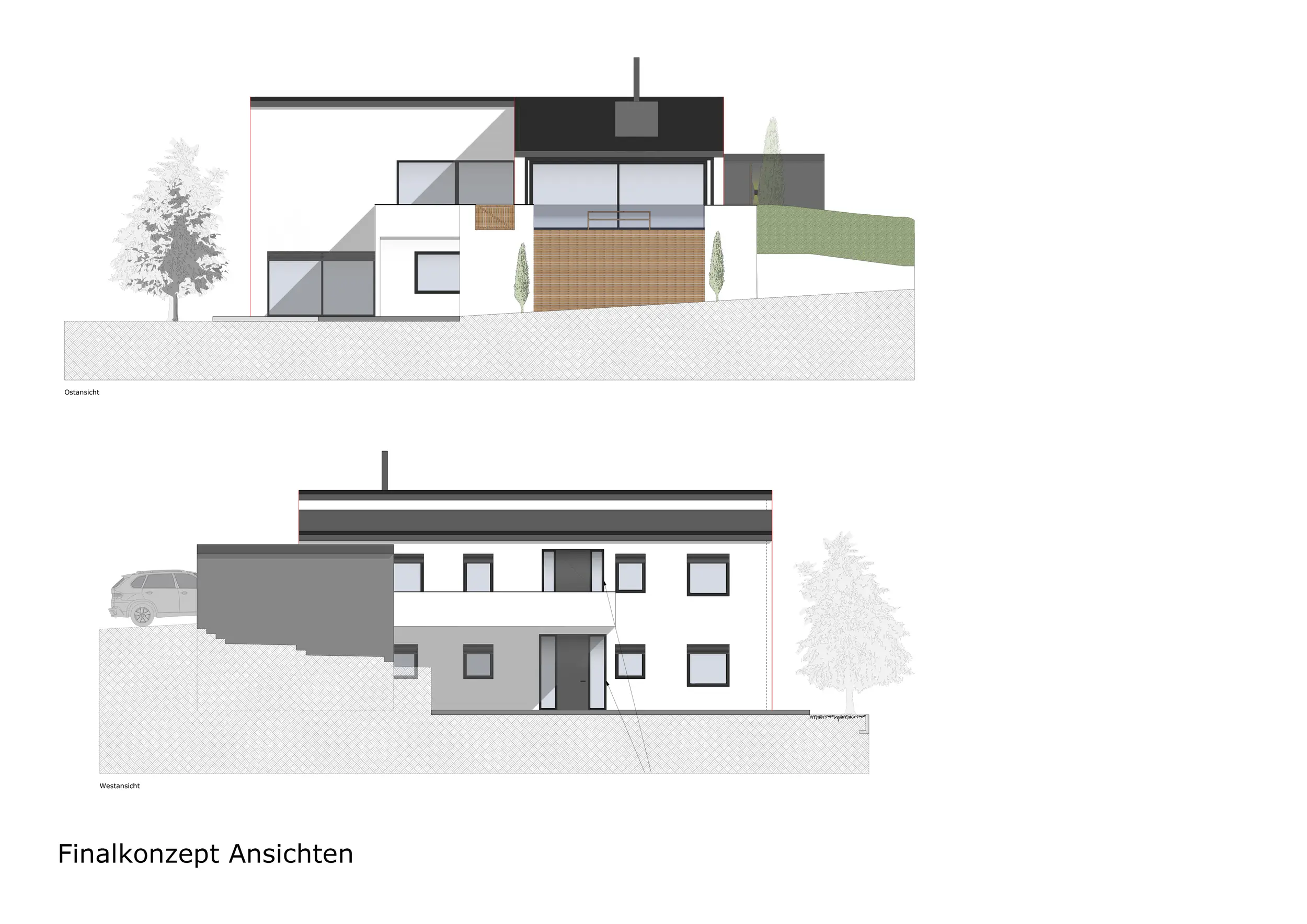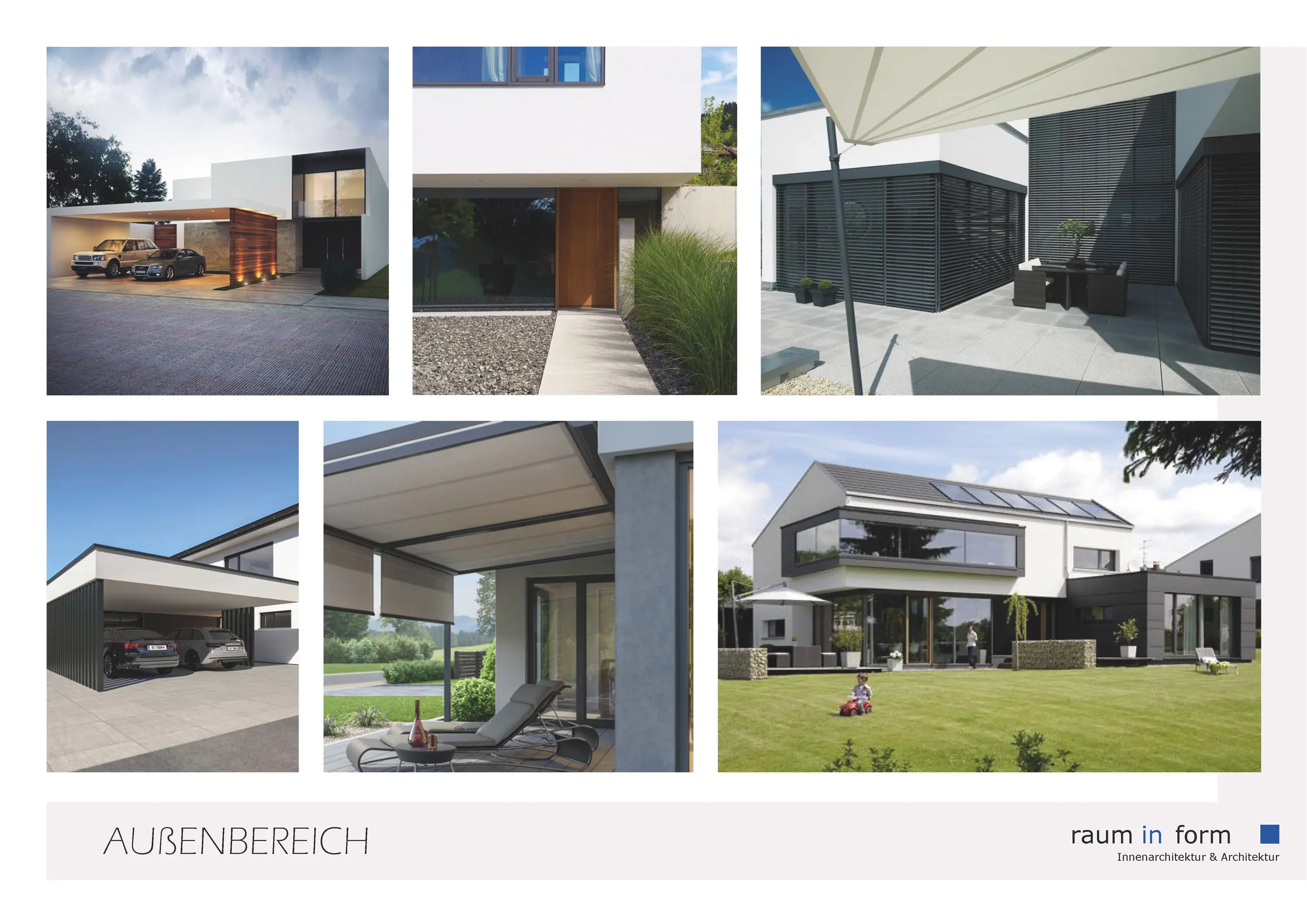 Für den Außenbereich und die Fassade lag der Fokus auf anthrazitfarbenen Fassadenflächen und Fensterrahmen, großzügigen Verglasungen, Schiebetürelementen sowie möglichen Übereckverglasungen. Ergänzend wurden Gestaltungsideen für die Zufahrt, einen überdachten Carport, die Balkongestaltung inklusive Jacuzzi sowie verschiedene Varianten der Eingangssituation dargestellt.