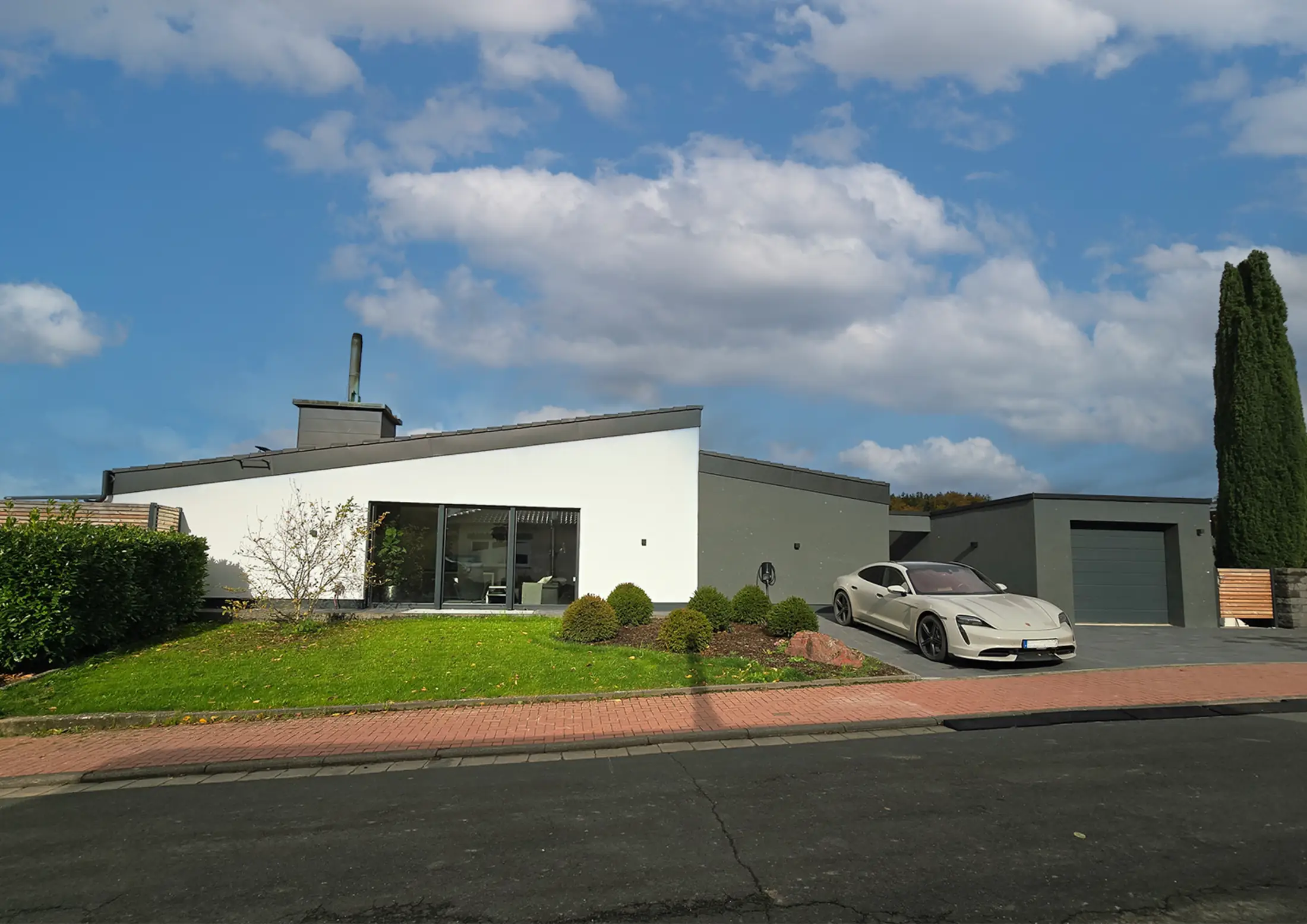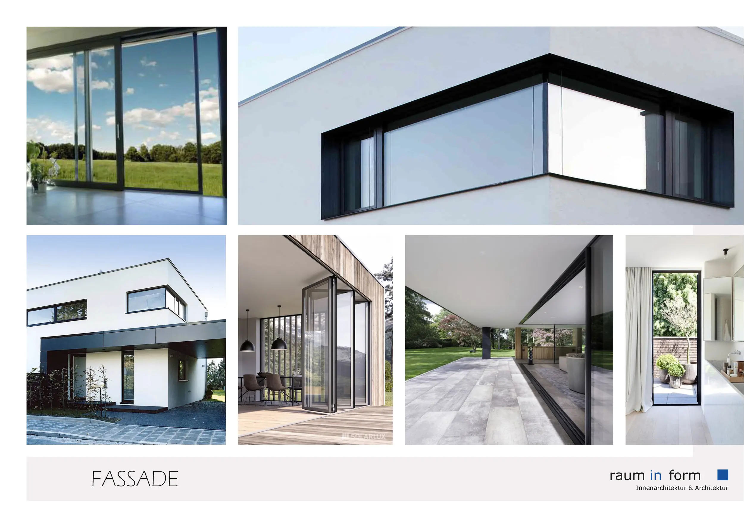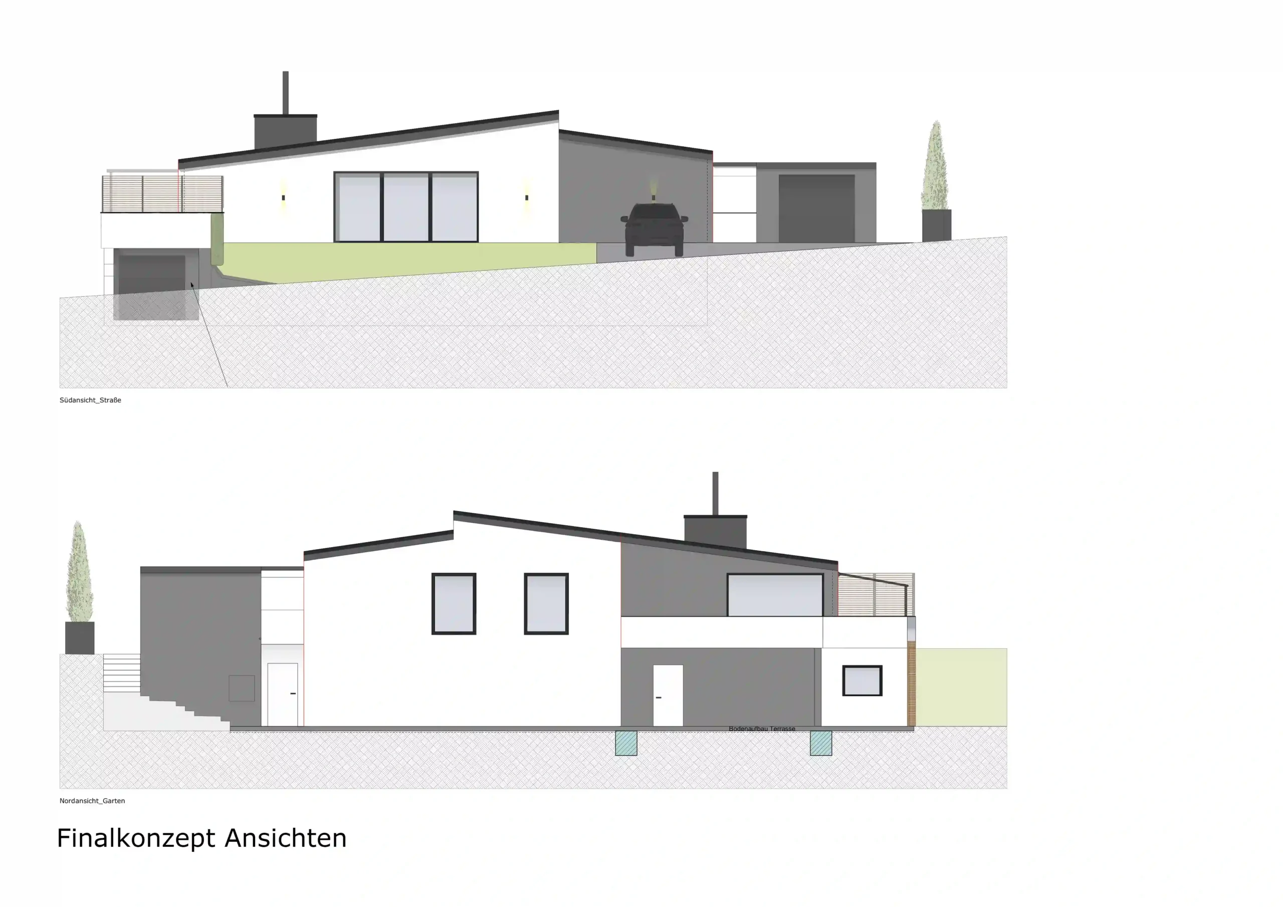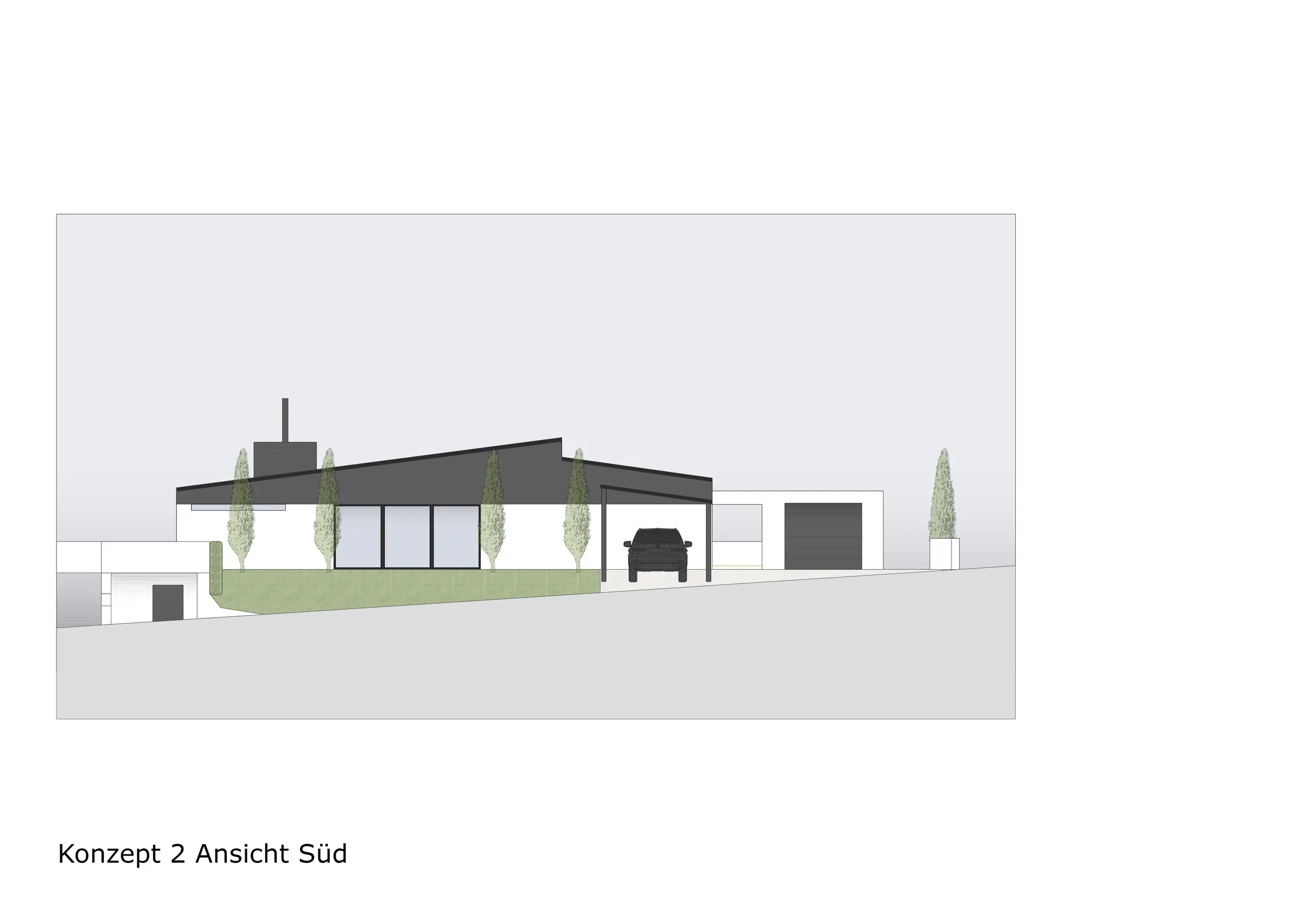 Für den Außenbereich und die Fassade lag der Fokus auf anthrazitfarbenen Fassadenflächen und Fensterrahmen, großzügigen Verglasungen, Schiebetürelementen sowie möglichen Übereckverglasungen. Ergänzend wurden Gestaltungsideen für die Zufahrt, einen überdachten Carport, die Balkongestaltung inklusive Jacuzzi sowie verschiedene Varianten der Eingangssituation dargestellt.