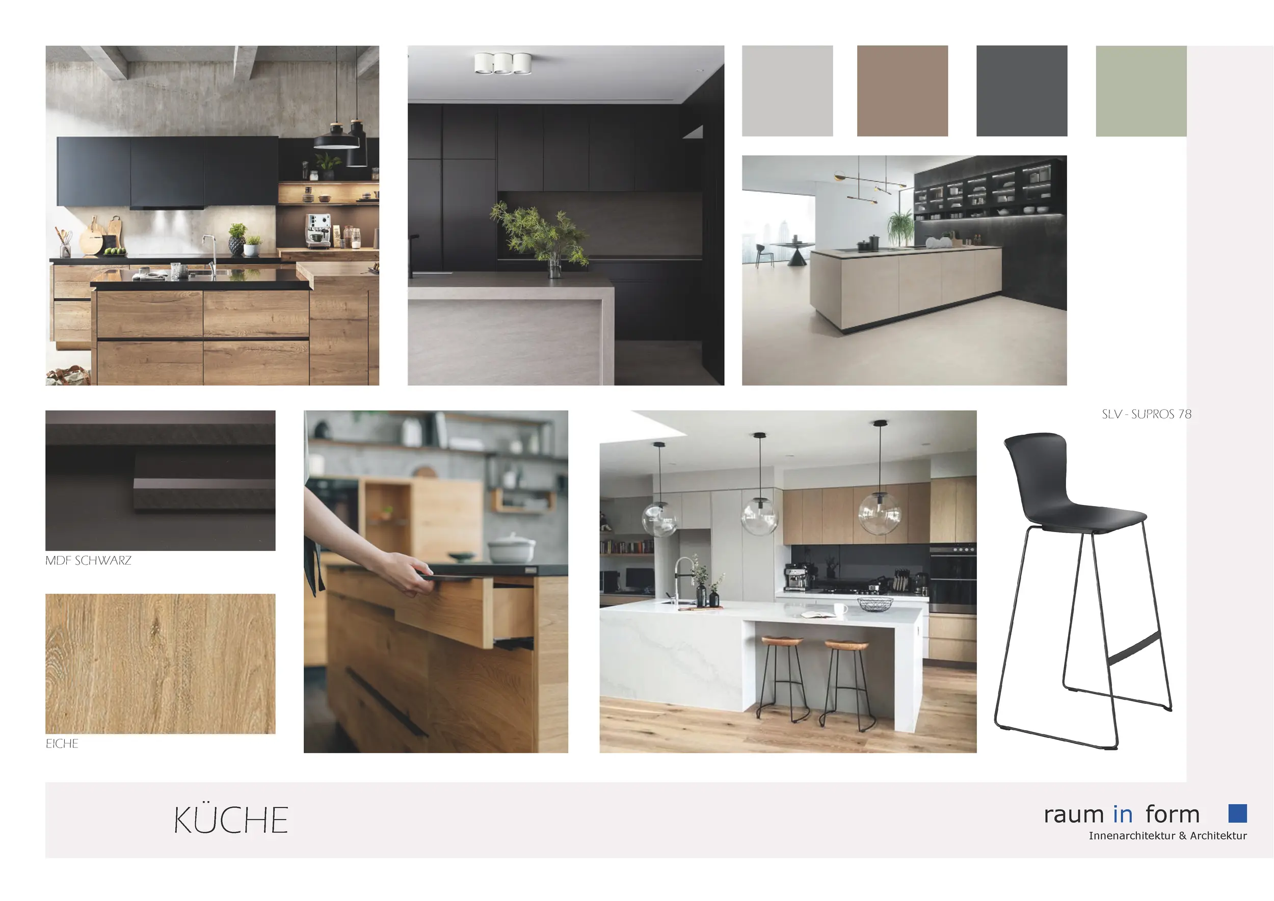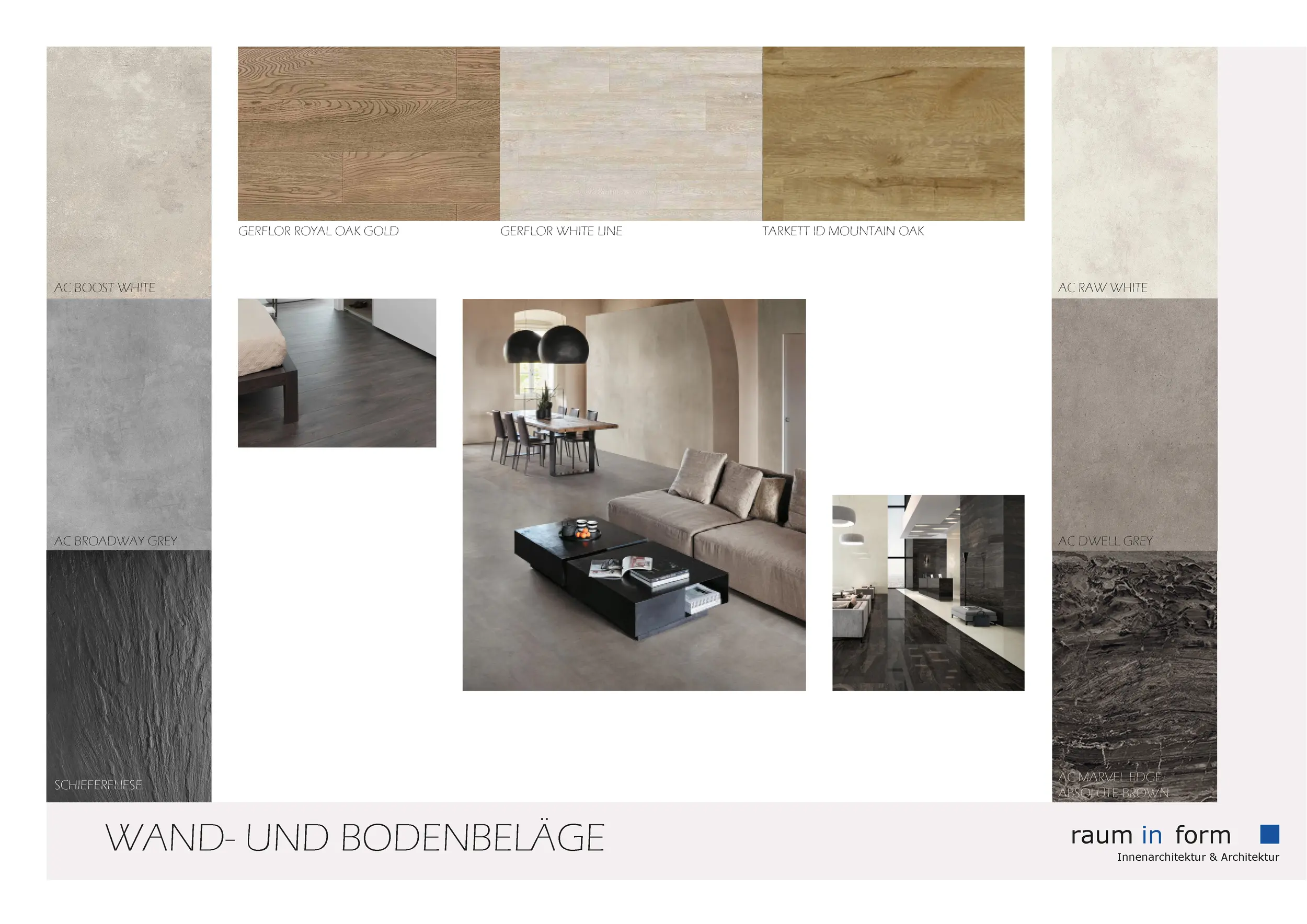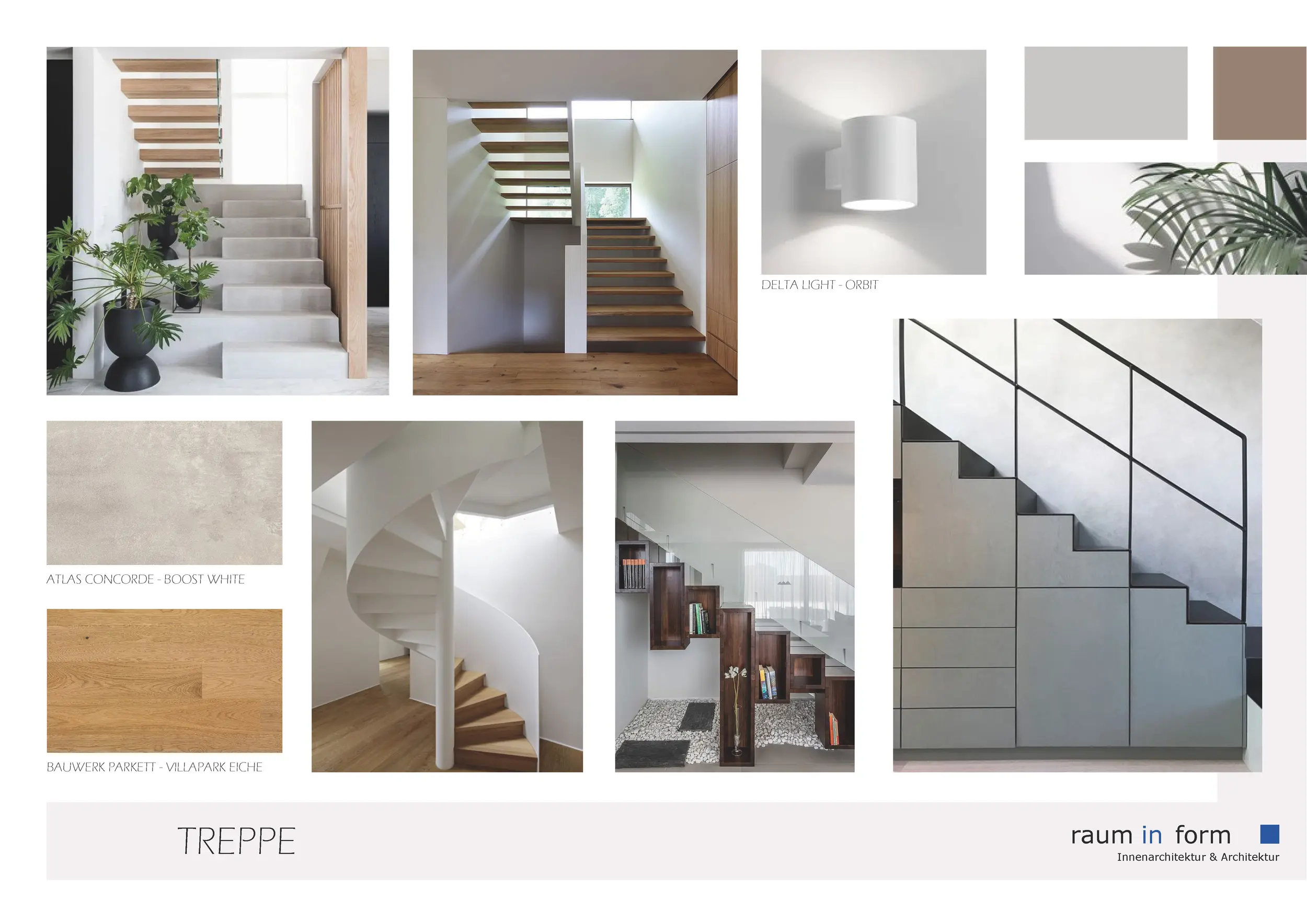 Ergänzend zu den Konzeptplanungen entwickelte wurde „raum in form – Innenarchitektur & Architektur“ auf Wunsch der Bauherren mehrere Moodboards. In zuvor definierten Kategorien wurden jeweils A3-Layouts mit material- und gestaltungsbezogenen Vorschlägen erstellt, die auf das Projekt und die Vorlieben der Bauherren abgestimmt waren.