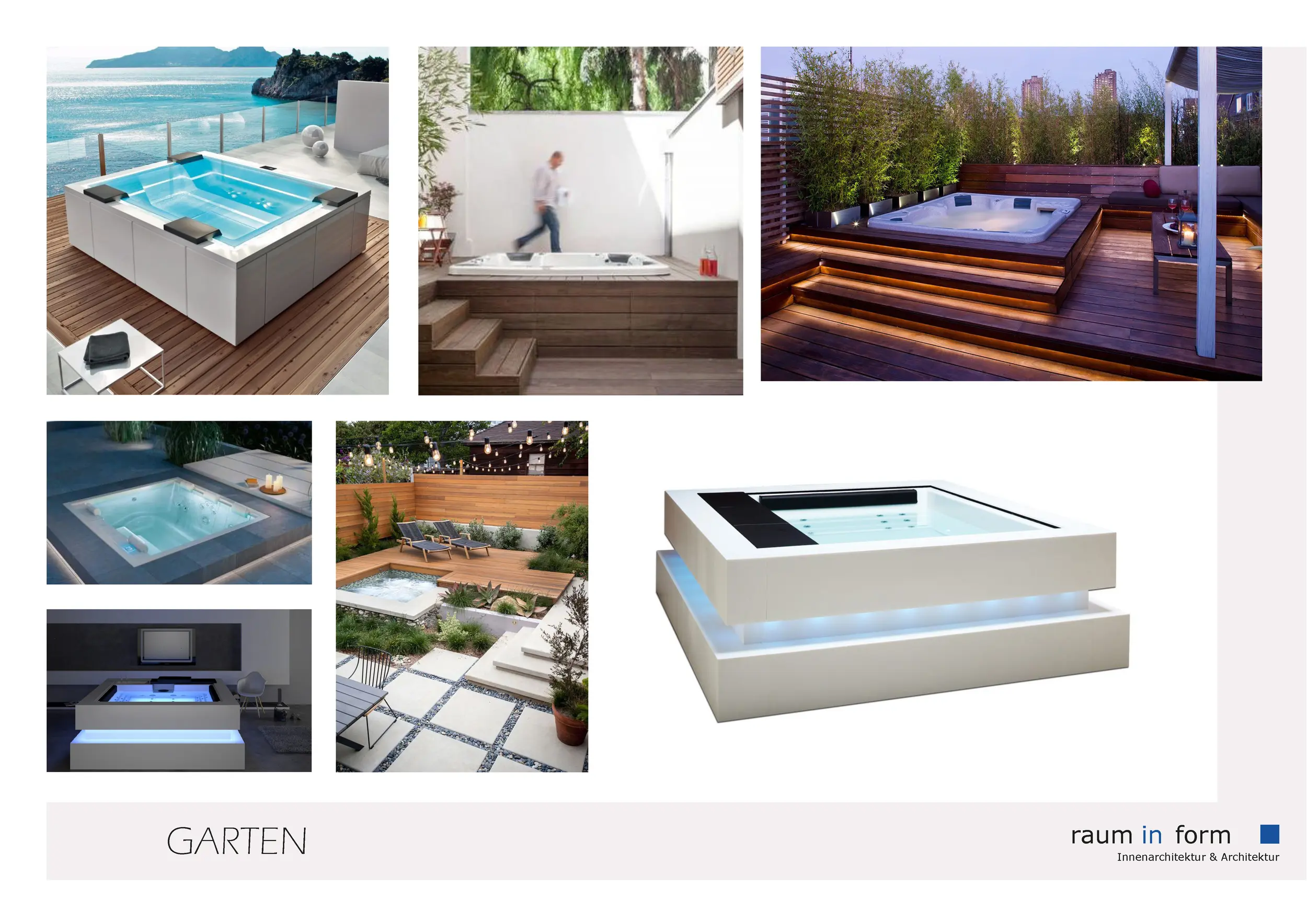 Da der bestehende Balkon keine ausreichende Fläche für einen Jacuzzi bot, wurde dieser im Garten auf der neu geplanten Terrasse positioniert. Neben dem Jacuzzi wurden hier Sitzmöglichkeiten sowie Liegeflächen vorgesehen.