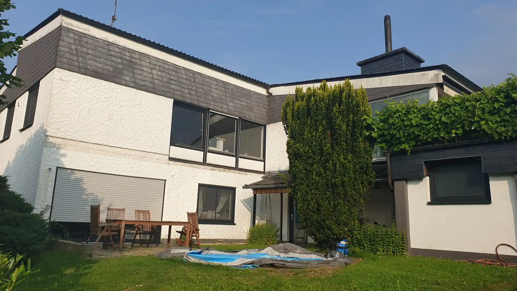 Vor dem Umbau wies das Gebäude unterschiedliche Bodenbeläge, einen unzeitgemäßen Wintergarten sowie undichte Fenster auf. Der Zugang zum Kellergeschoss erfolgte über eine schwankende Wendeltreppe, die den heutigen Anforderungen an Sicherheit und Komfort nicht mehr gerecht wurde. Auch die bestehende Fassadengestaltung mit Kellenputz und Schieferplatten entsprach nicht den modernen Vorstellungen der Bauherren.