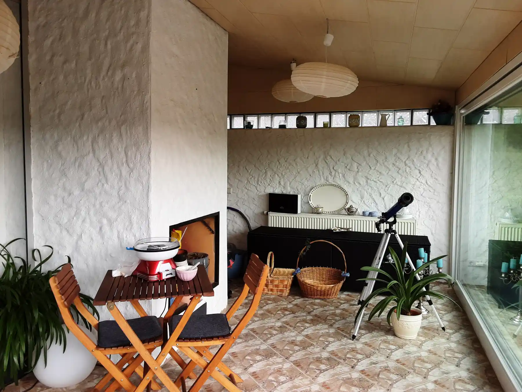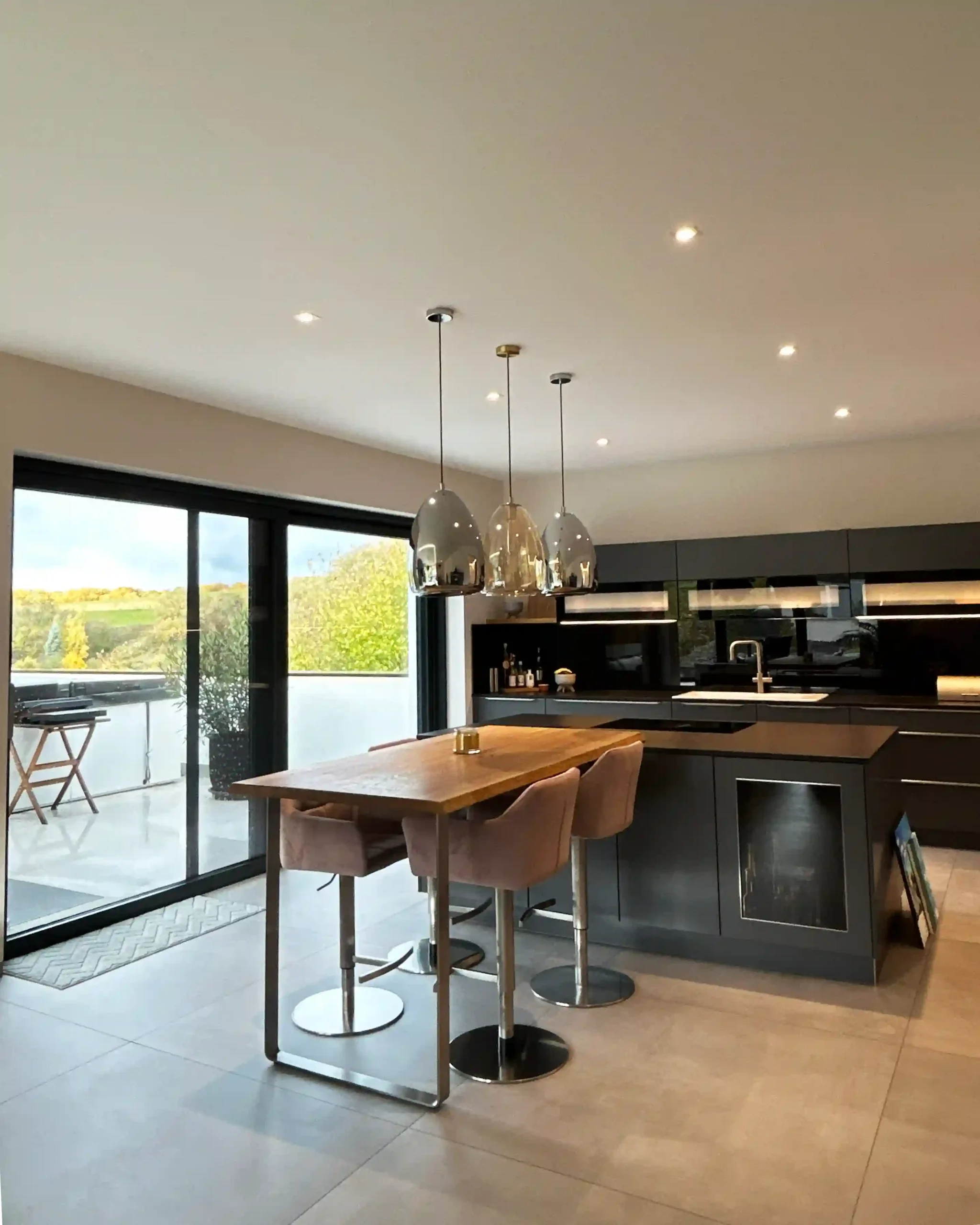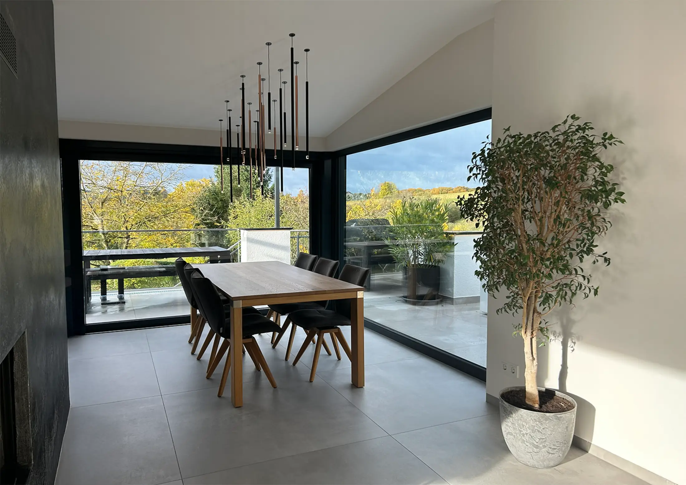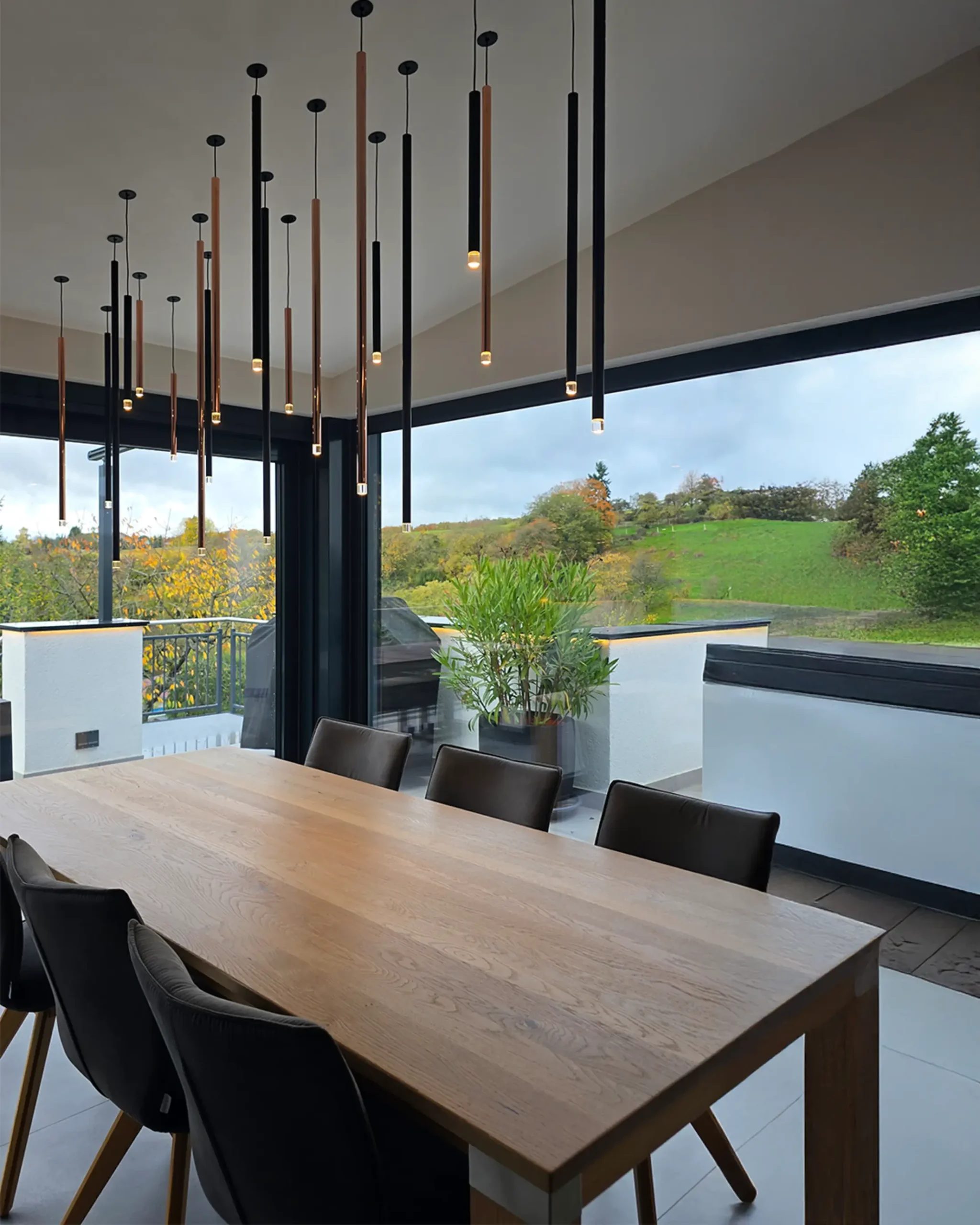 Der Wintergarten wurde dem Wohnraum zugeordnet und beherbergt nun den Esstisch, der von einem Ensemble aus 20 Pendelleuchten atmosphärisch in Szene gesetzt wird.