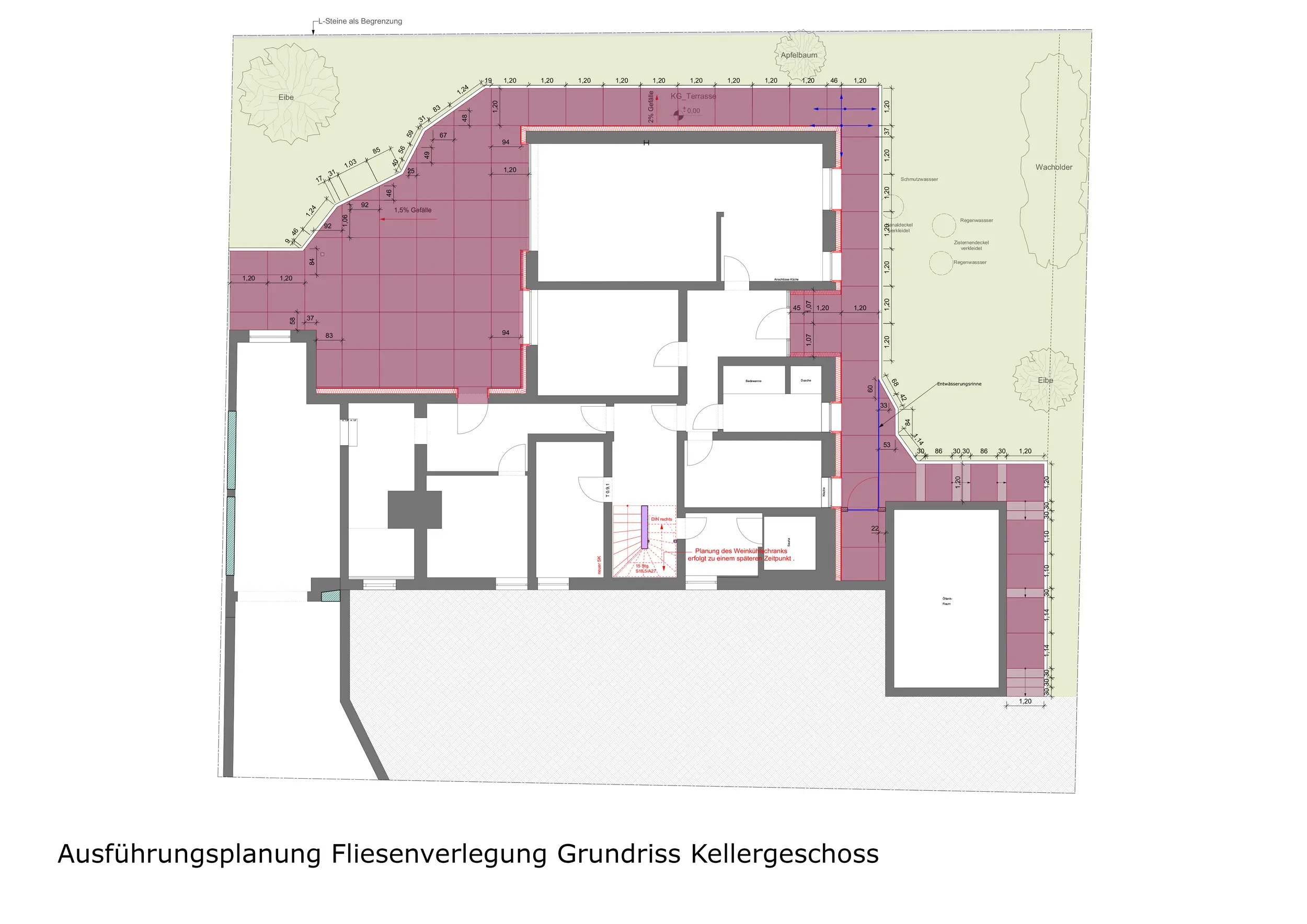 Im Kellergeschoss wurde der Innenraum – abgesehen von der Treppe – nicht verändert. Der Außenbereich wurde jedoch neu gedacht: Umlaufend um das Gebäude wurde ein Weg geplant, westlich des Hauses entstand eine großzügige Terrasse mit Sitz- und Liegeflächen. Der darüberliegende Balkon bildet einen geschützten Bereich für den darunterliegenden Außenraum.