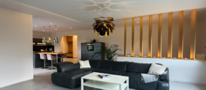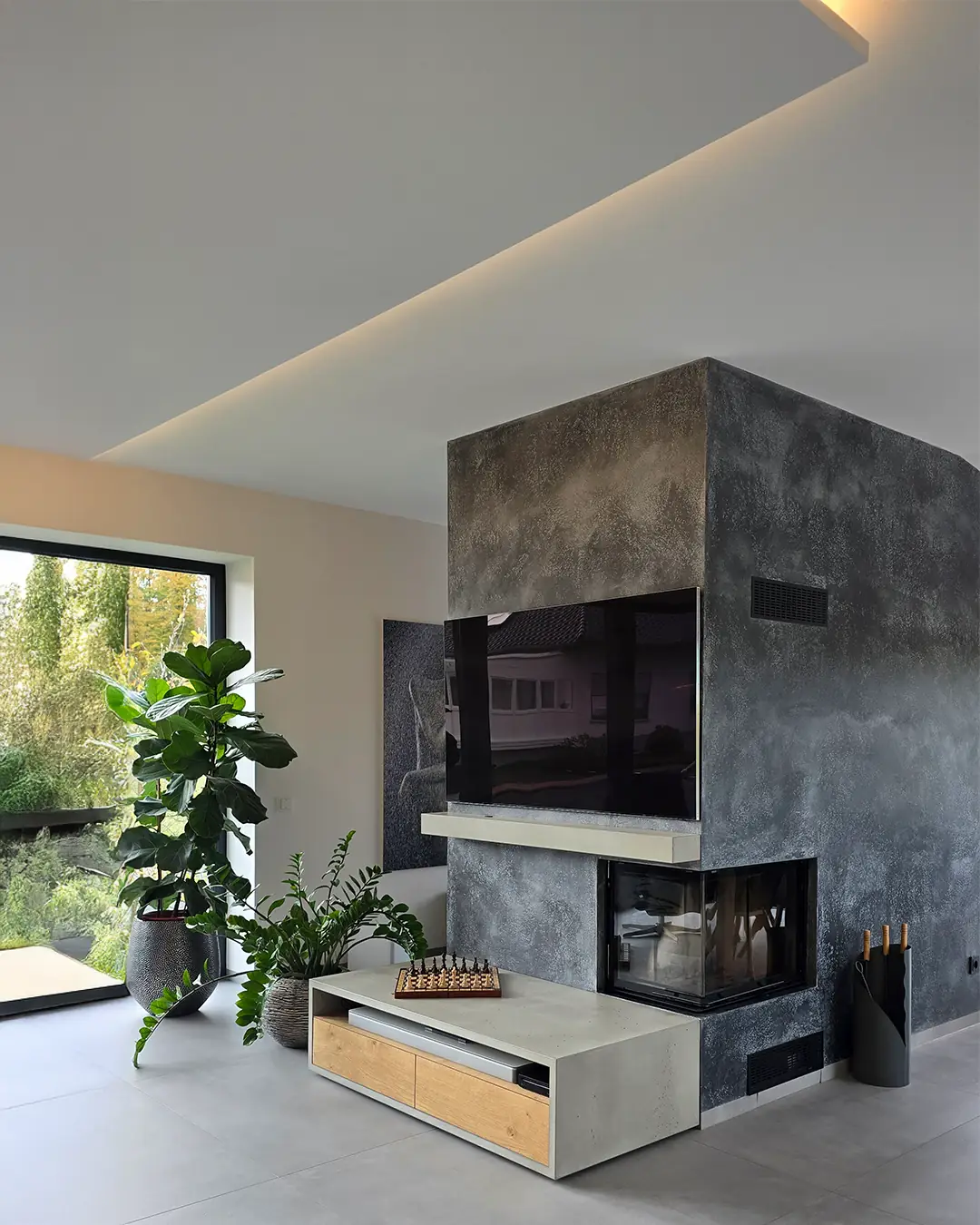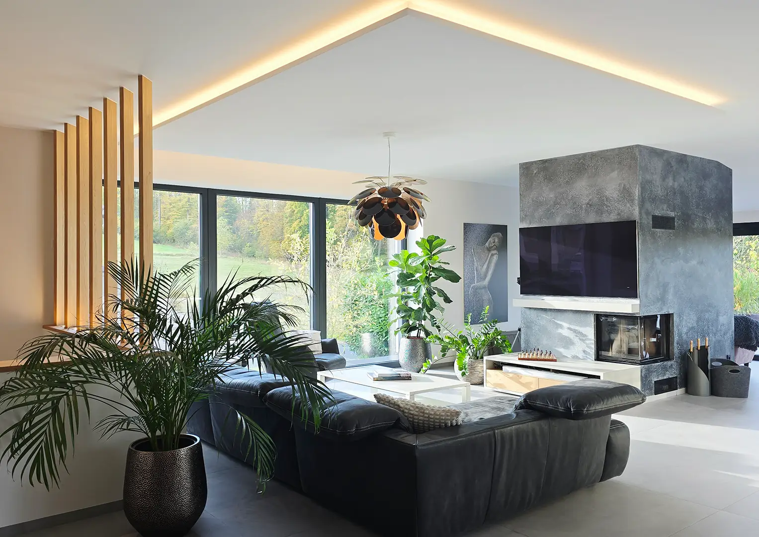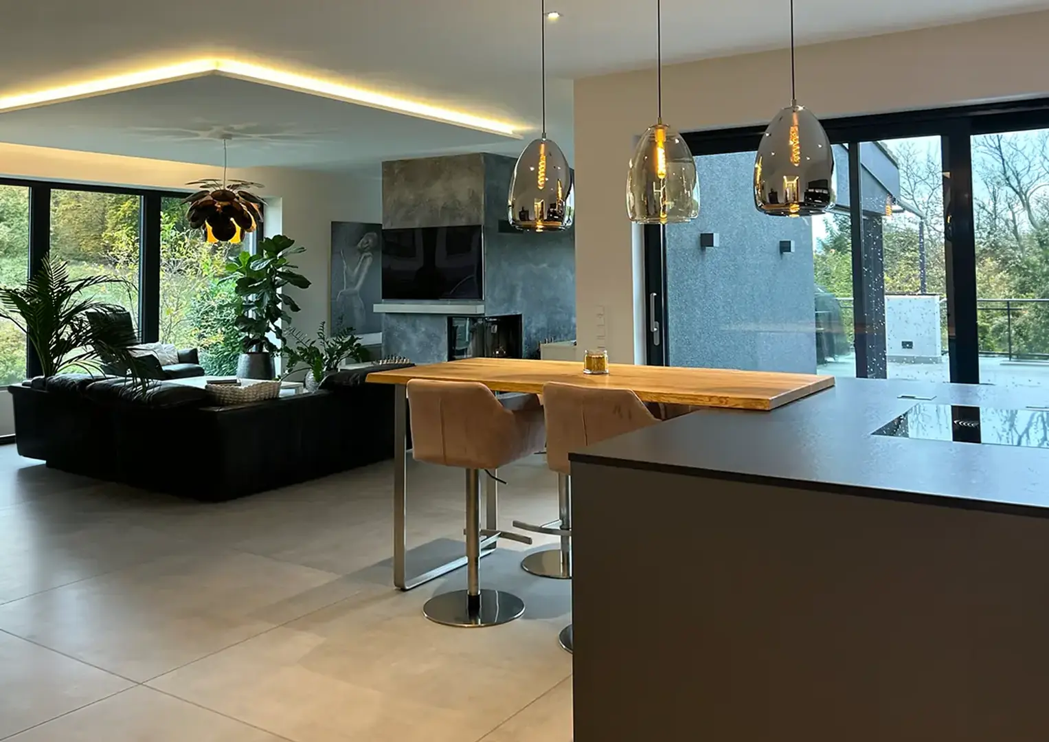 Nach der Fertigstellung präsentiert sich das Einfamilienhaus als modernes, harmonisch gestaltetes Wohngebäude. Die indirekte Beleuchtung verleiht den neu gestalteten Innenräumen in Kombination mit den Bestandsmöbeln eine stimmige Atmosphäre. Großzügige Fensterflächen eröffnen den Blick ins Grüne und in den neu inszenierten Wohnbereich, dessen zentrales Highlight der neue Kamin mit exklusiver Wandgestaltung bildet.