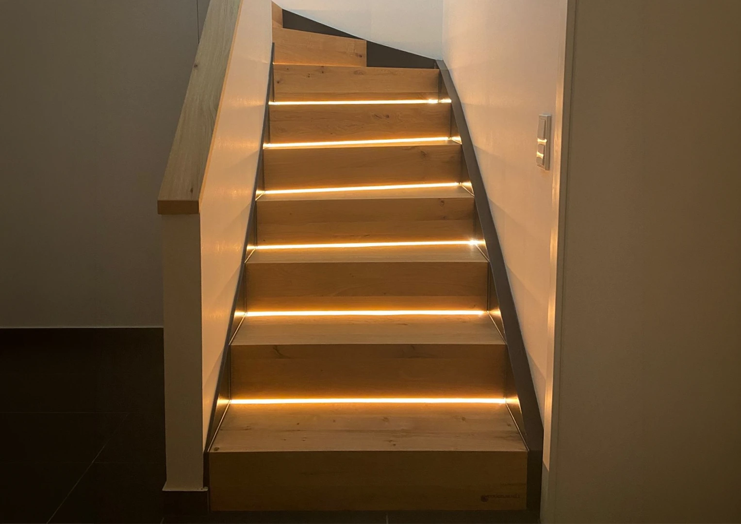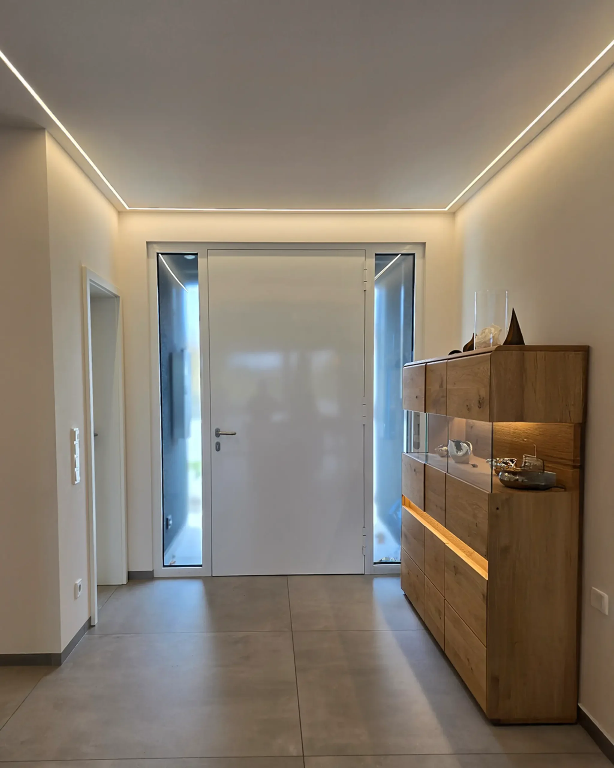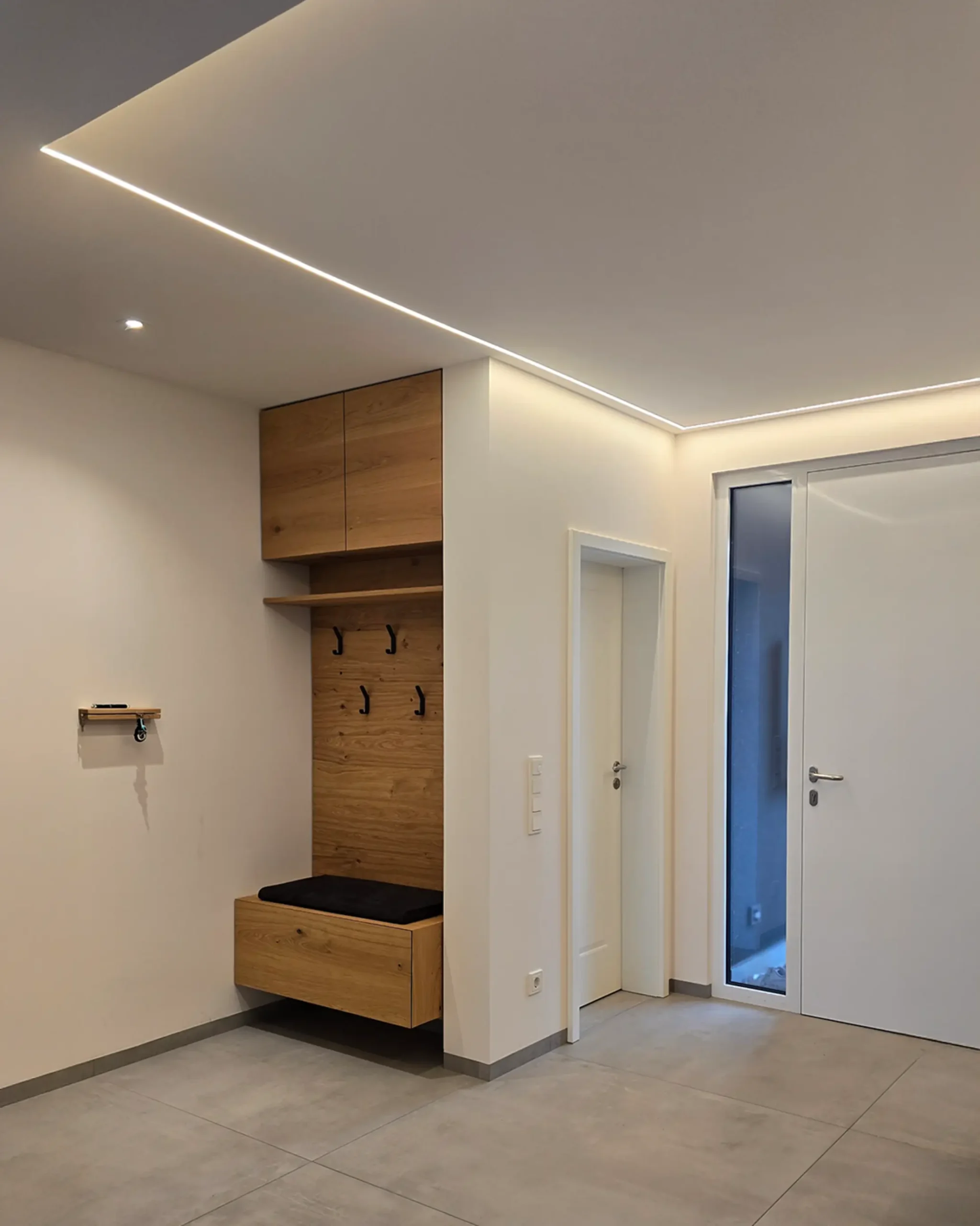 Die geplante indirekte Beleuchtung in Nischen und Schränken trägt wesentlich zur Steigerung der Raumatmosphäre bei und setzt gezielte Lichtakzente. Ergänzend dazu wird im Eingangsbereich ein umlaufendes Lichtband vorgesehen, das den Raum sanft umschließt und für eine angenehme indirekte Beleuchtung sorgt. Auch die Treppenstufen werden mittels eines integrierten Lichtbandes indirekt beleuchtet, wodurch nicht nur die Sicherheit erhöht, sondern zugleich ein hochwertiger und moderner Gesamteindruck erzeugt wird.