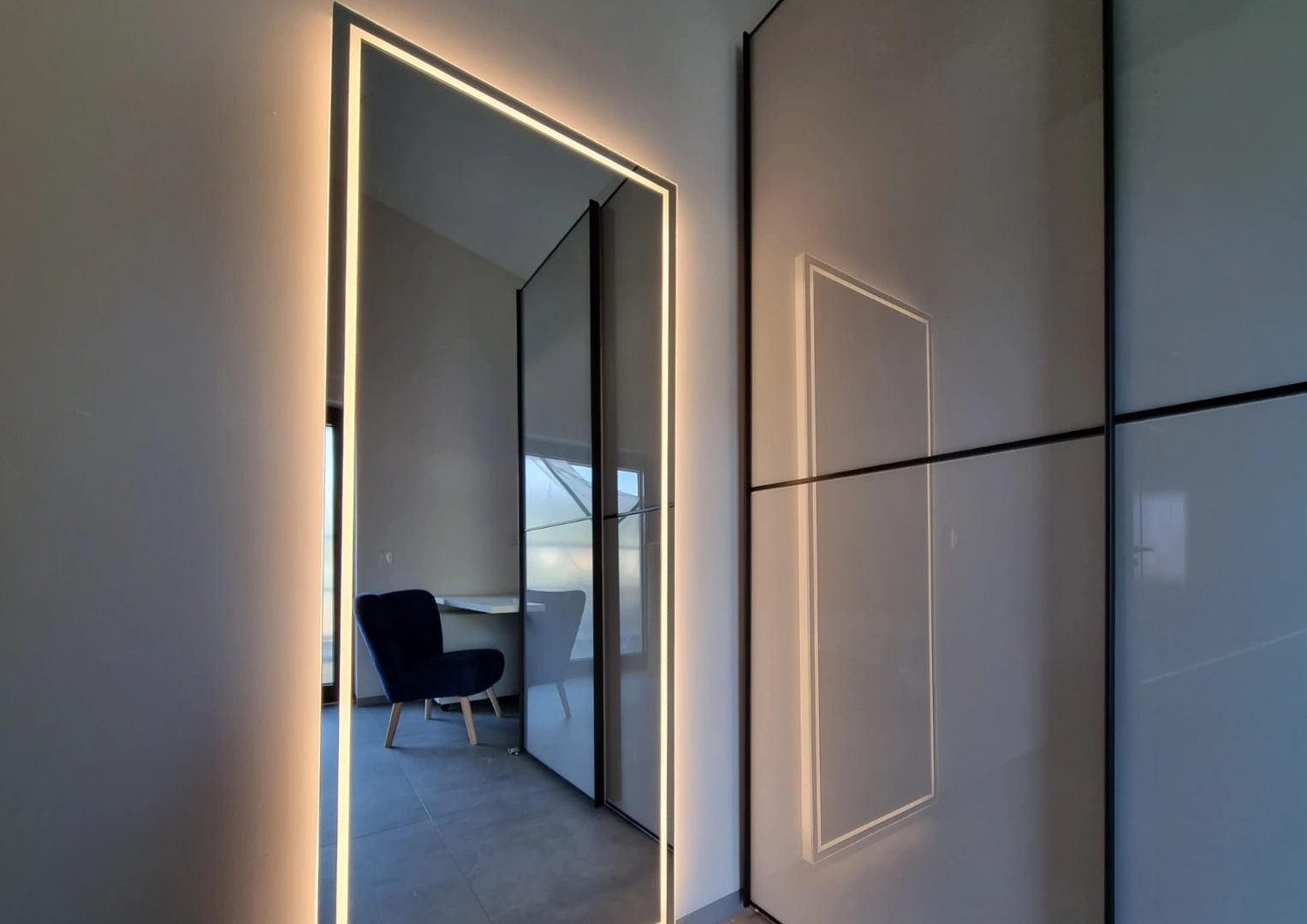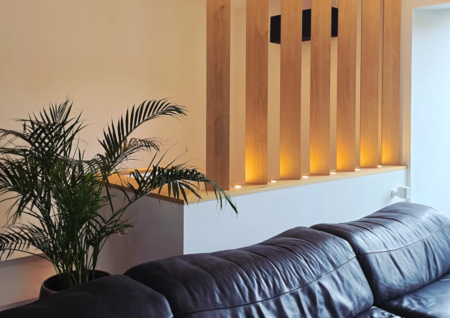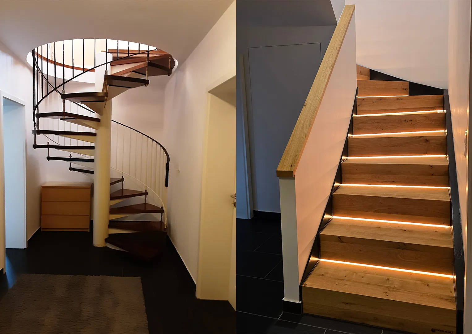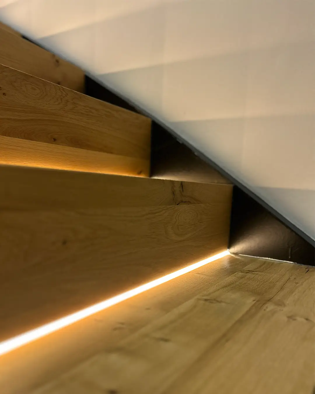 Die geplante indirekte Beleuchtung in Nischen und Schränken trägt wesentlich zur Steigerung der Raumatmosphäre bei und setzt gezielte Lichtakzente. Ergänzend dazu wird im Eingangsbereich ein umlaufendes Lichtband vorgesehen, das den Raum sanft umschließt und für eine angenehme indirekte Beleuchtung sorgt. Auch die Treppenstufen werden mittels eines integrierten Lichtbandes indirekt beleuchtet, wodurch nicht nur die Sicherheit erhöht, sondern zugleich ein hochwertiger und moderner Gesamteindruck erzeugt wird.