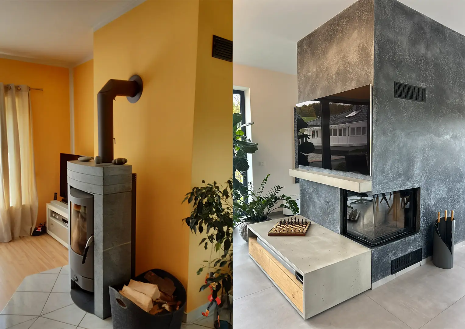 Im Finalkonzept wurde der gesamte Kollektivbereich des Hauses vollständig modernisiert. Die neue Küche mit Kücheninsel und integriertem Esstisch bildet nun das kommunikative Zentrum des Erdgeschosses. Der Wohnbereich wurde neu inszeniert, indem der Bestandskamin zu einem zweiseitigen Kamin umgebaut wurde. Die Kaminwand erhielt eine spezielle Putztechnik, die als markanter Blickfang dient.