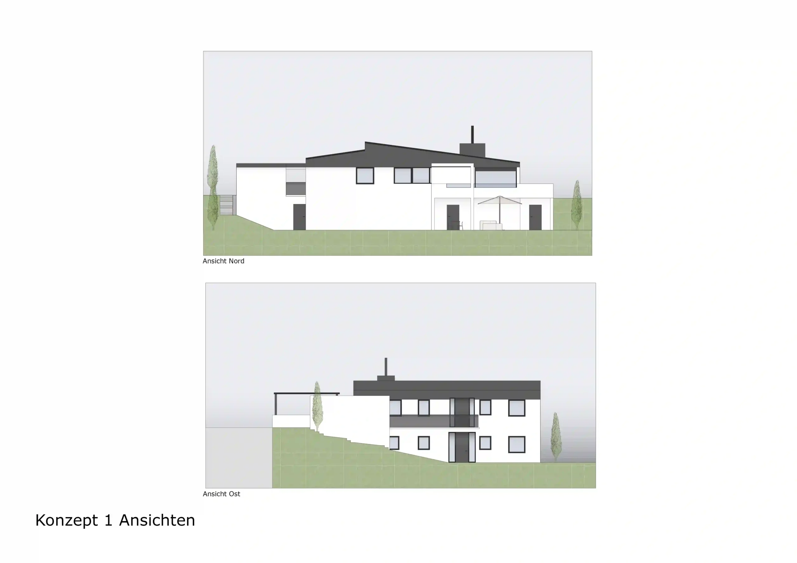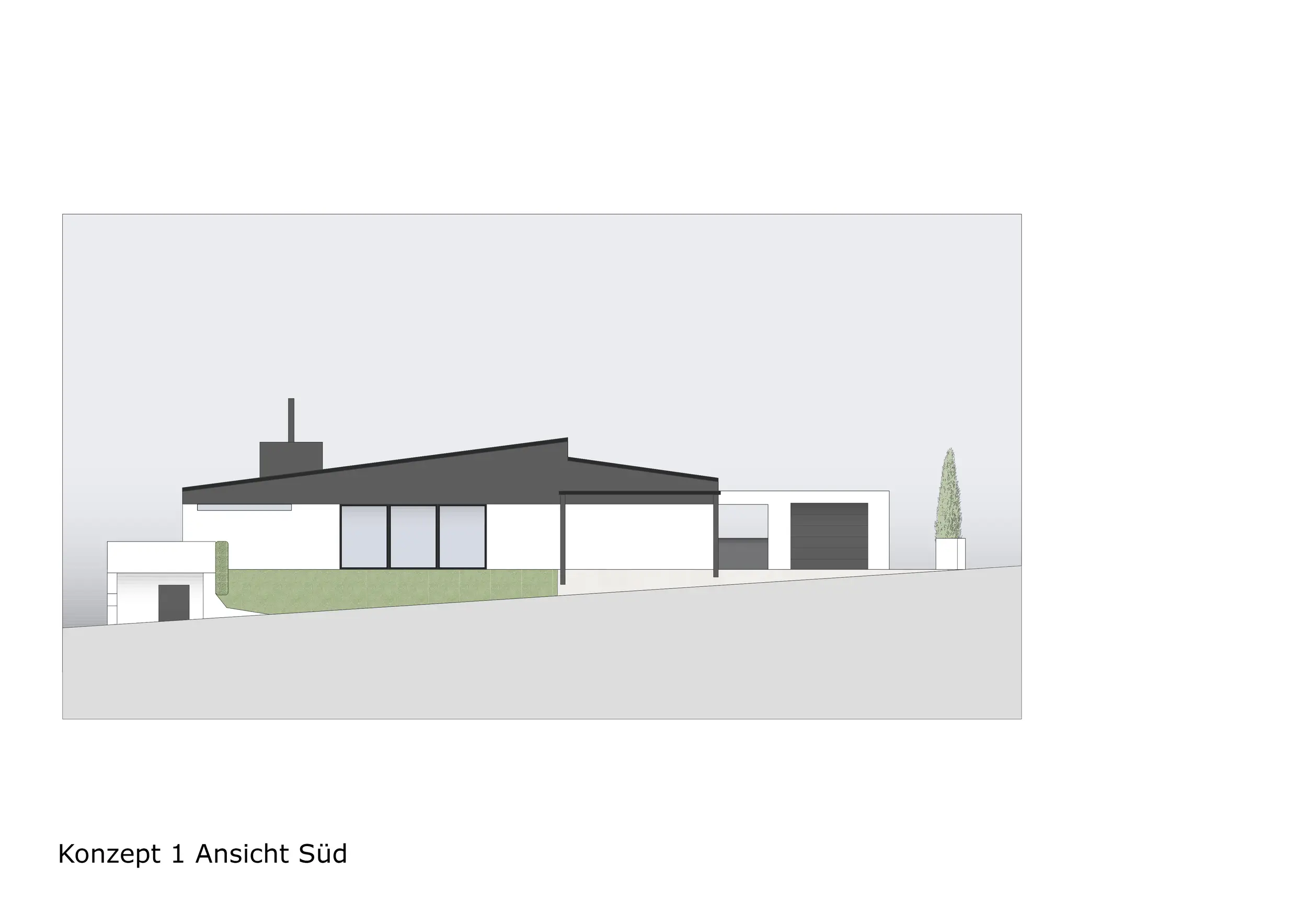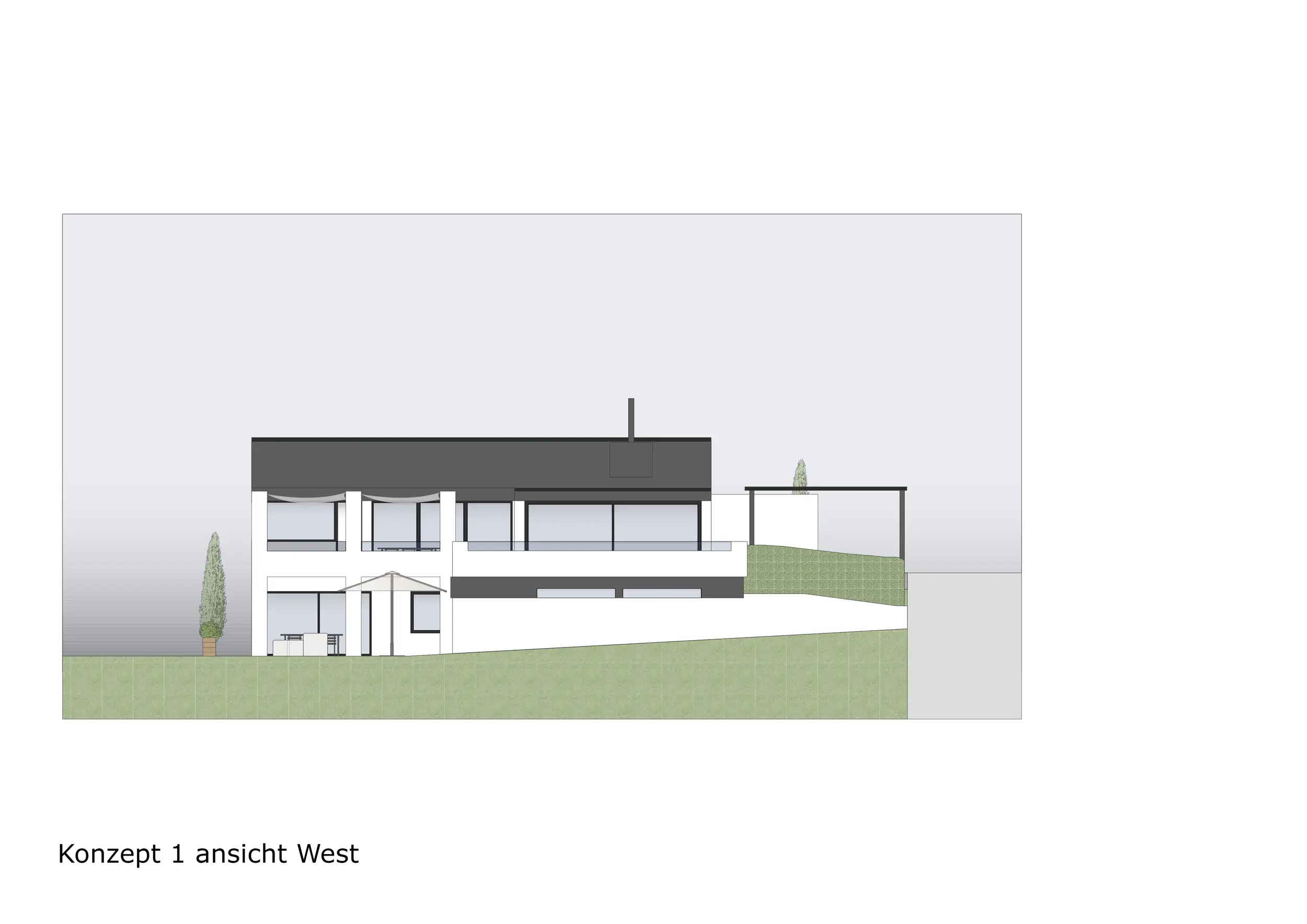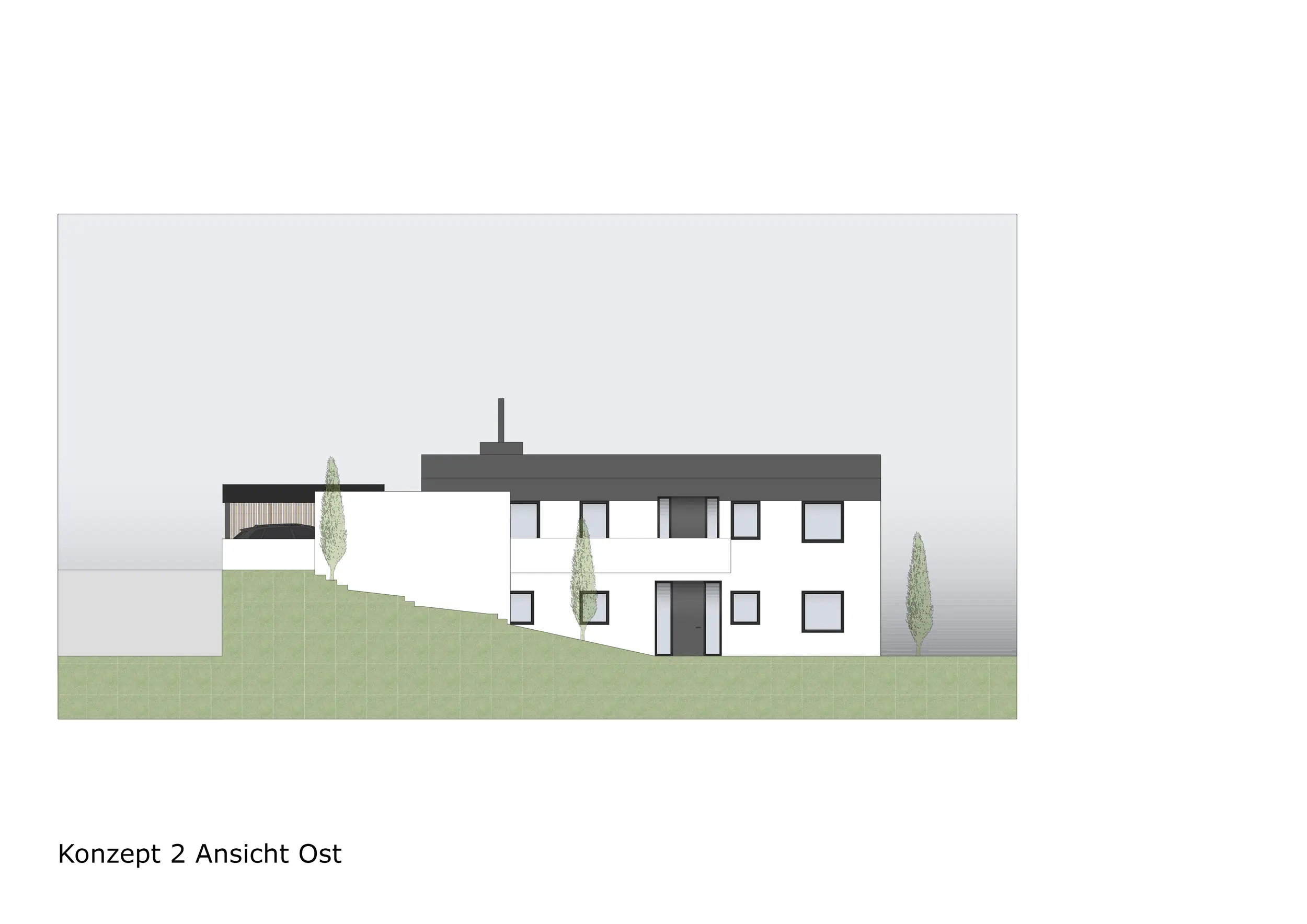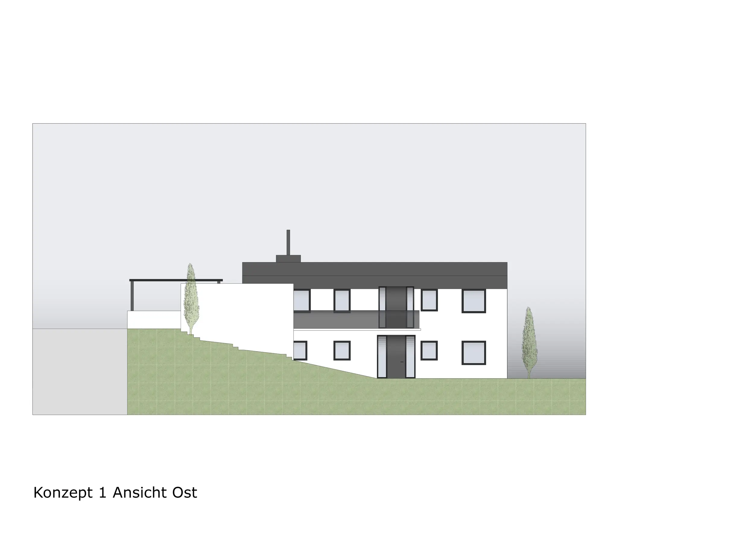 Im dritten Konzept blieb die Innenraumplanung identisch zu Konzept 2. Der wesentliche Unterschied lag in der Gestaltung des Balkons, der in seiner ursprünglichen Position beibehalten wurde. Der Zugang in den Garten erfolgt hier über eine einläufige Treppe.