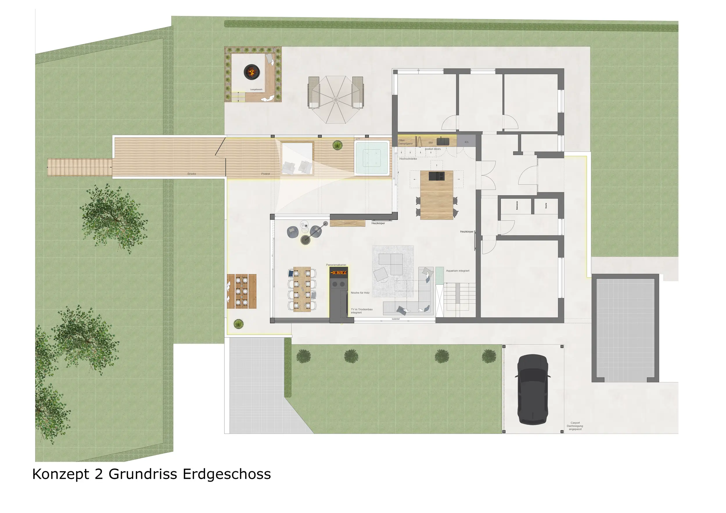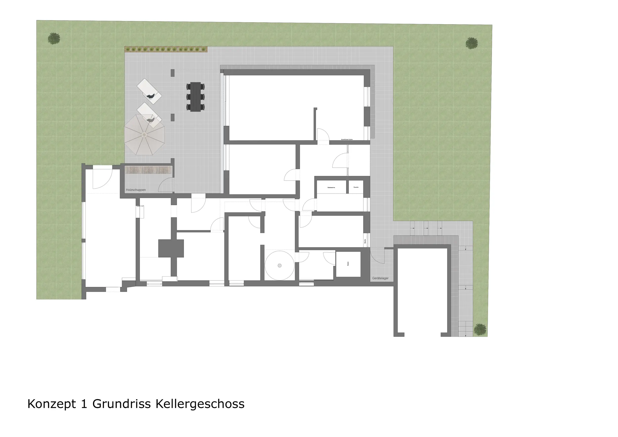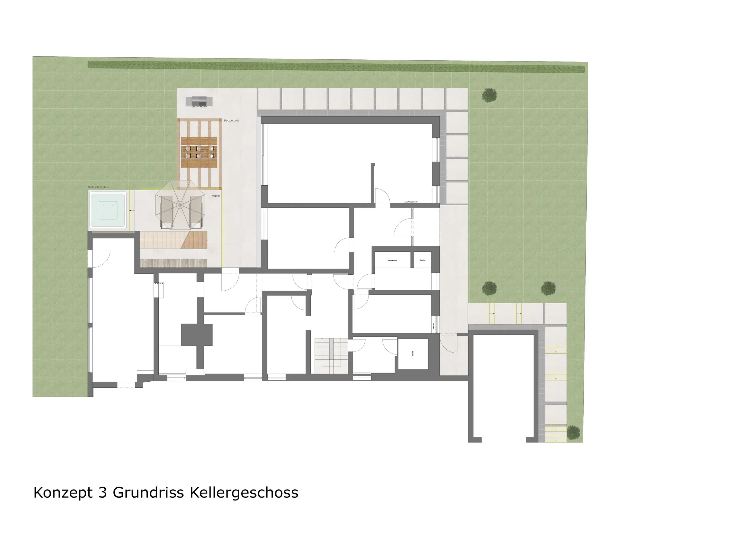Der Außenbereich wurde im Vergleich zu Konzept 1 weiter in den Garten gezogen. Zusätzlich zur Terrasse wurde eine Outdoorküche mit Essbereich direkt am Gebäude integriert. Eine Liegefläche sowie eine Feuerstelle ergänzen das Nutzungskonzept. Der darüberliegende Balkon überdacht die darunterliegenden Außenflächen.