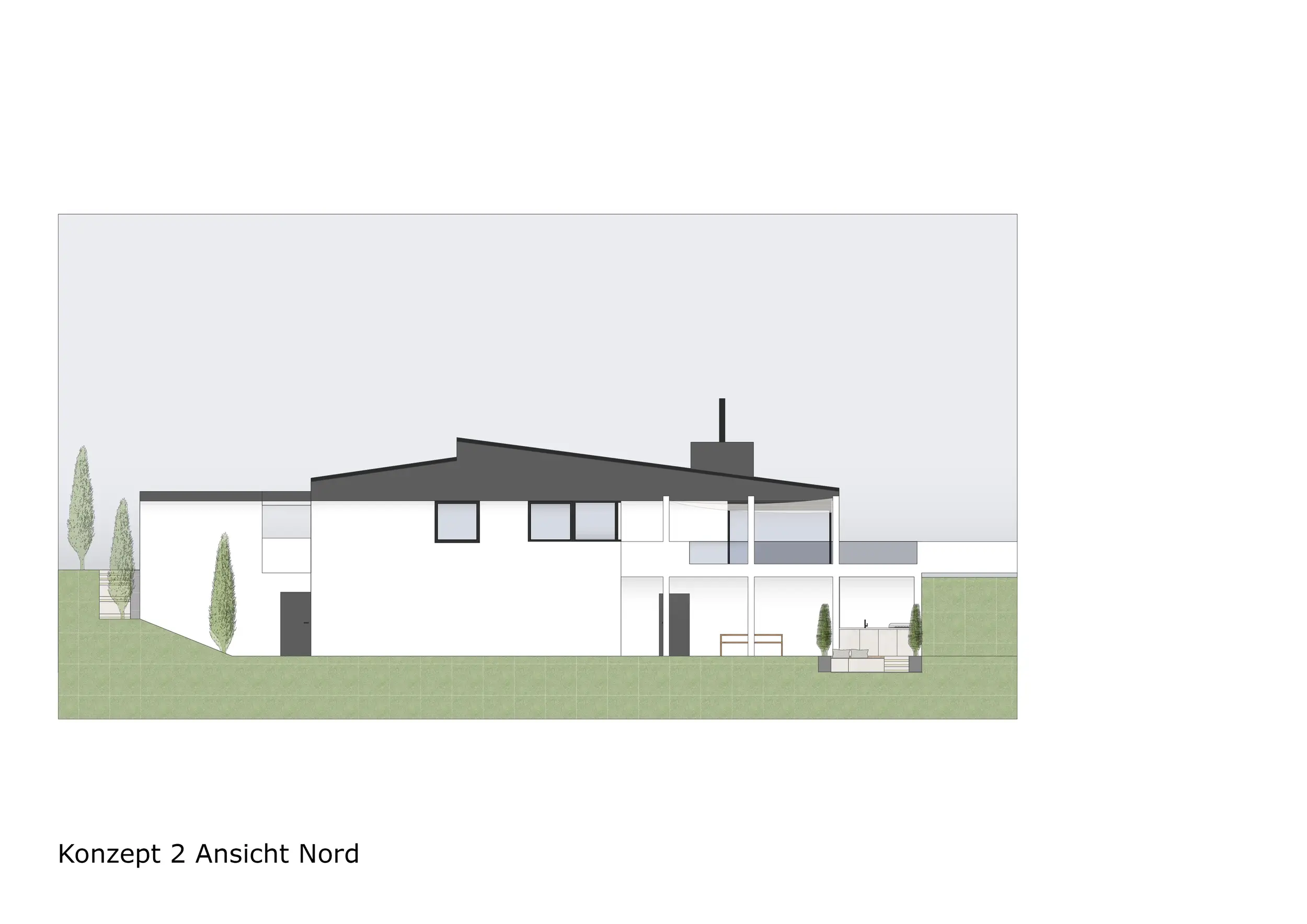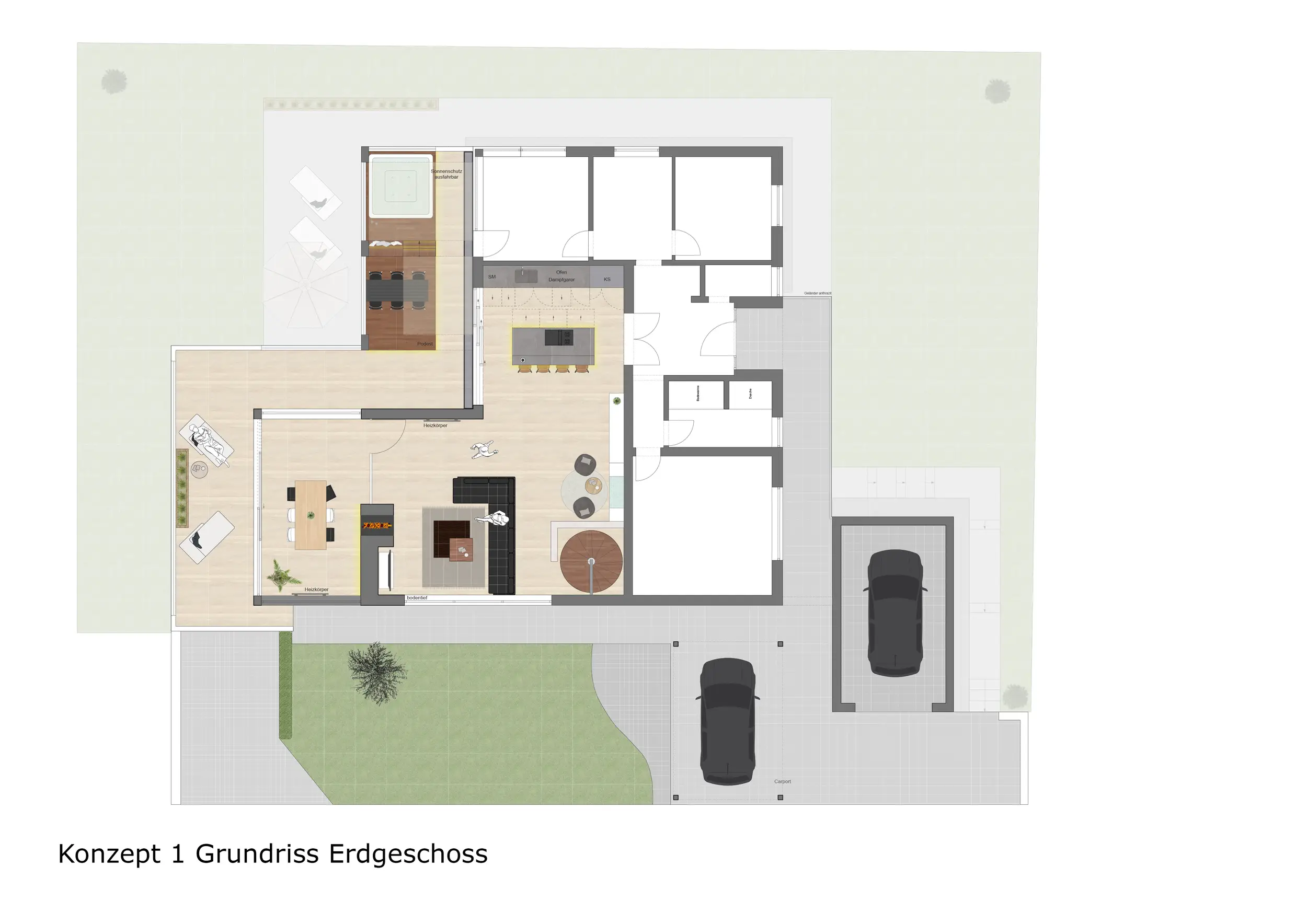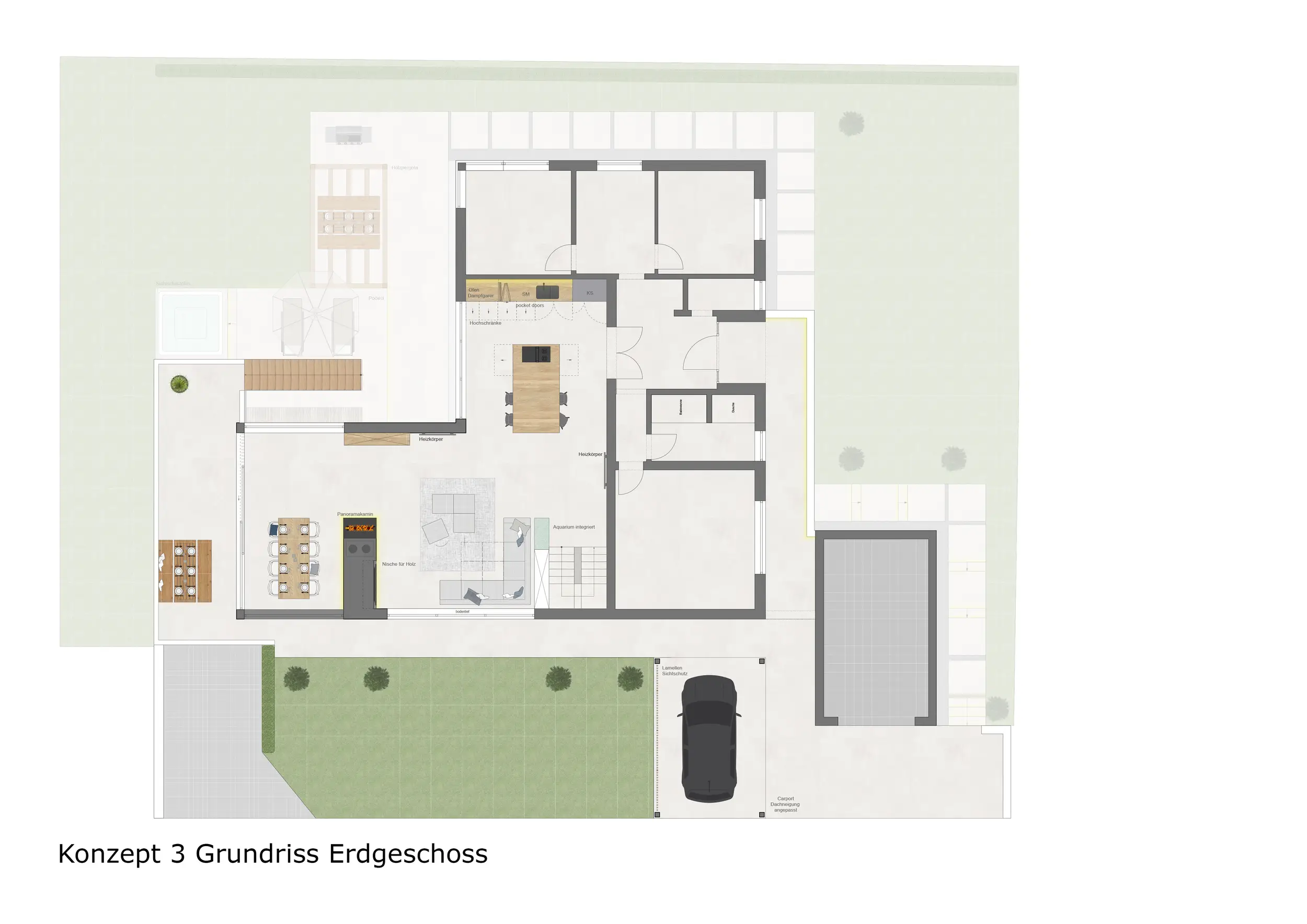 Der Außenbereich wurde im Vergleich zu Konzept 1 weiter in den Garten gezogen. Zusätzlich zur Terrasse wurde eine Outdoorküche mit Essbereich direkt am Gebäude integriert. Eine Liegefläche sowie eine Feuerstelle ergänzen das Nutzungskonzept. Der darüberliegende Balkon überdacht die darunterliegenden Außenflächen.